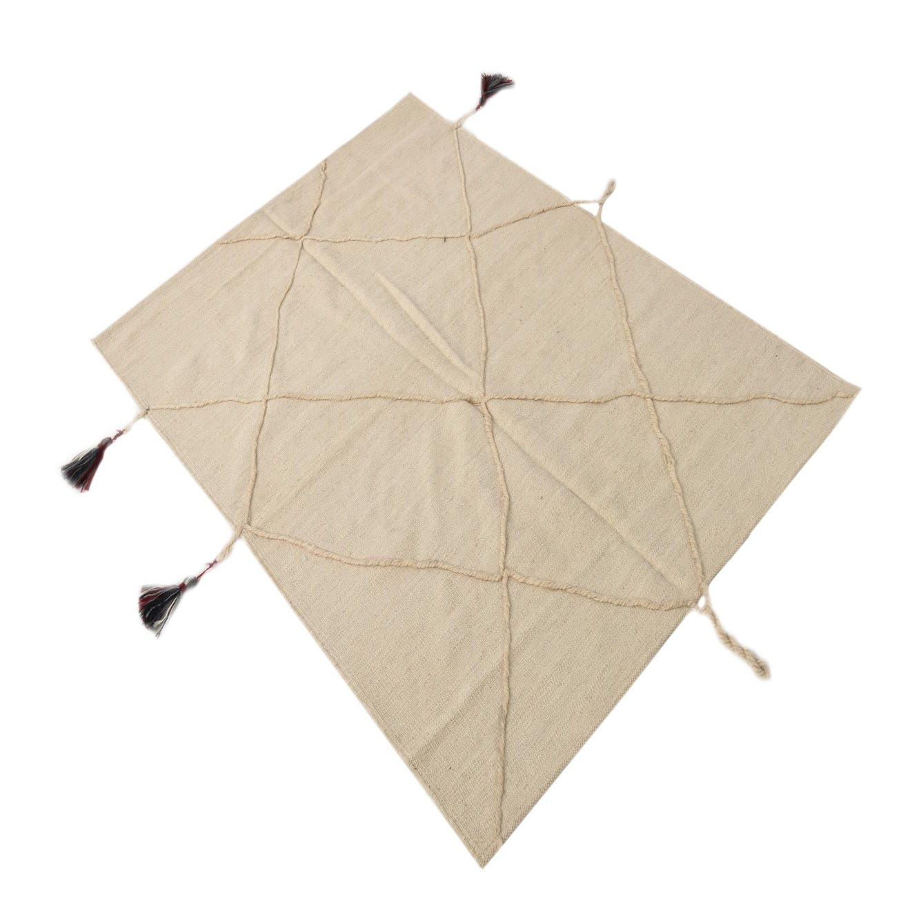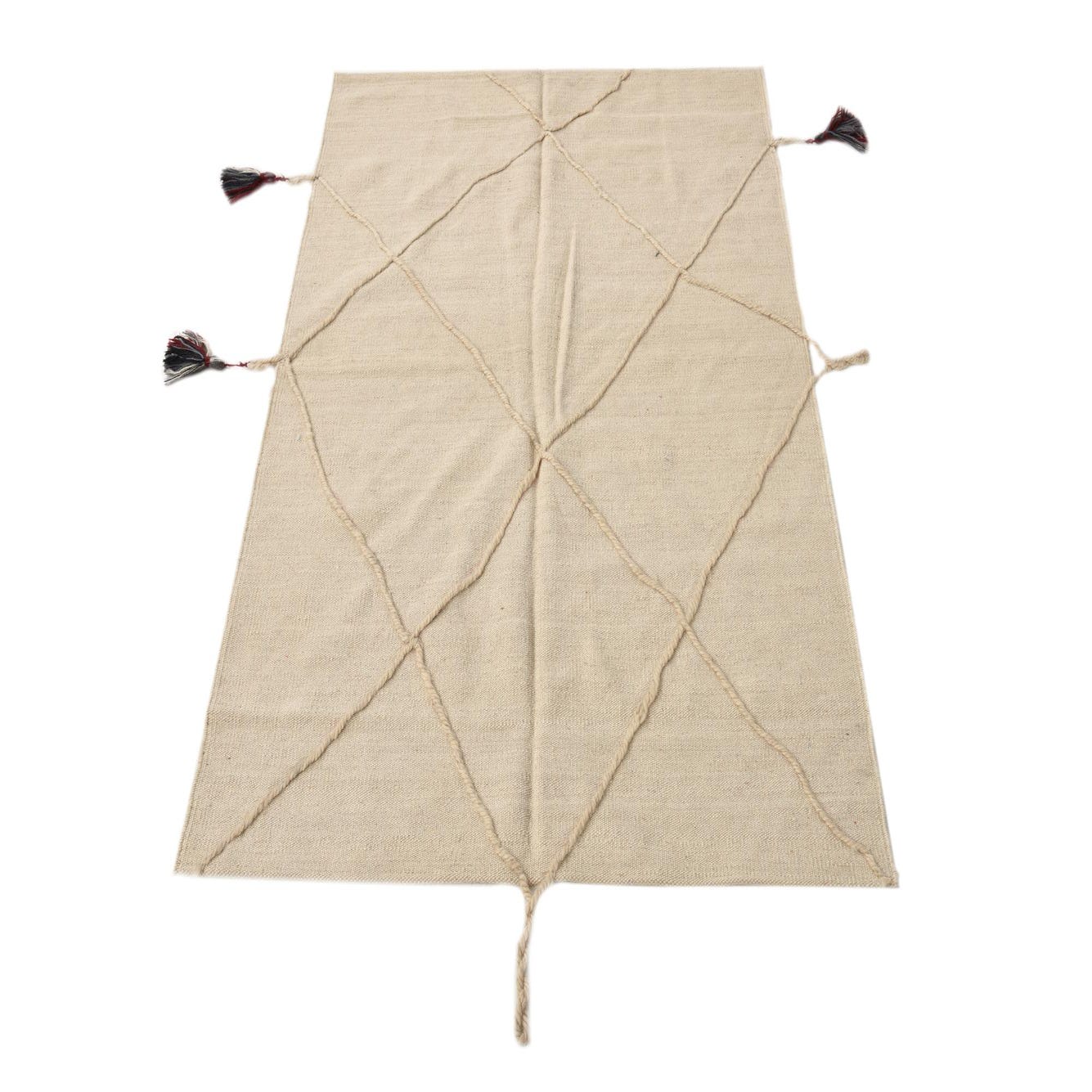 A 3x5 rectangular ivory flatweave wool rug with a tribal diamond pattern made from raised natural rope and decorative tassels.