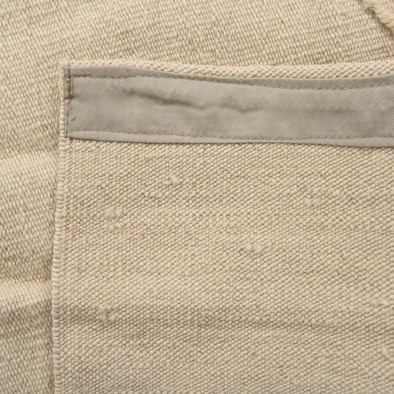 The rug's flatweave construction gives it a low pile, rendering it a practical choice for high-traffic areas or under furniture. The presence of fringe on either end adds a traditional element to its otherwise contemporary aesthetic. This versatile piece would integrate seamlessly within modern, Scandinavian, or minimalist interior themes. Its neutral base and subtle pop of color make it equally apt for bringing warmth to an office setting or understated elegance to a living room or bedroom.