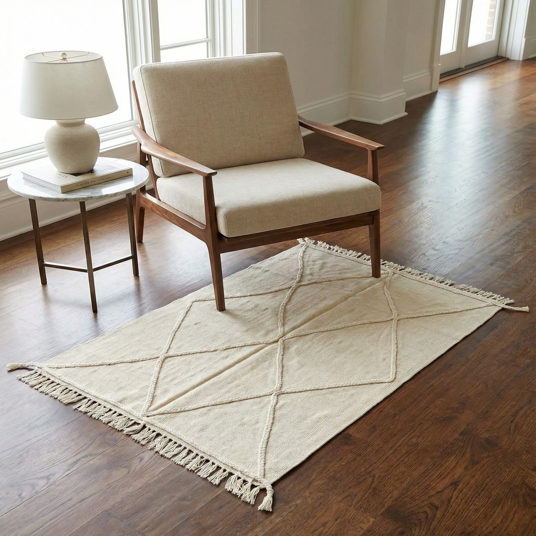 The rug is finished with fringe detailing that adds a touch of casual elegance, encapsulating the essence of modern craftsmanship. Owing to its neutral color palette, this rug is versatile and can be seamlessly integrated into various decor styles, from Scandinavian minimalism to more eclectic or bohemian interiors. It serves as an ideal base for rooms seeking a modern yet warm atmosphere, and its dimensions make it suitable for smaller living spaces, entryways, or cozy nooks.