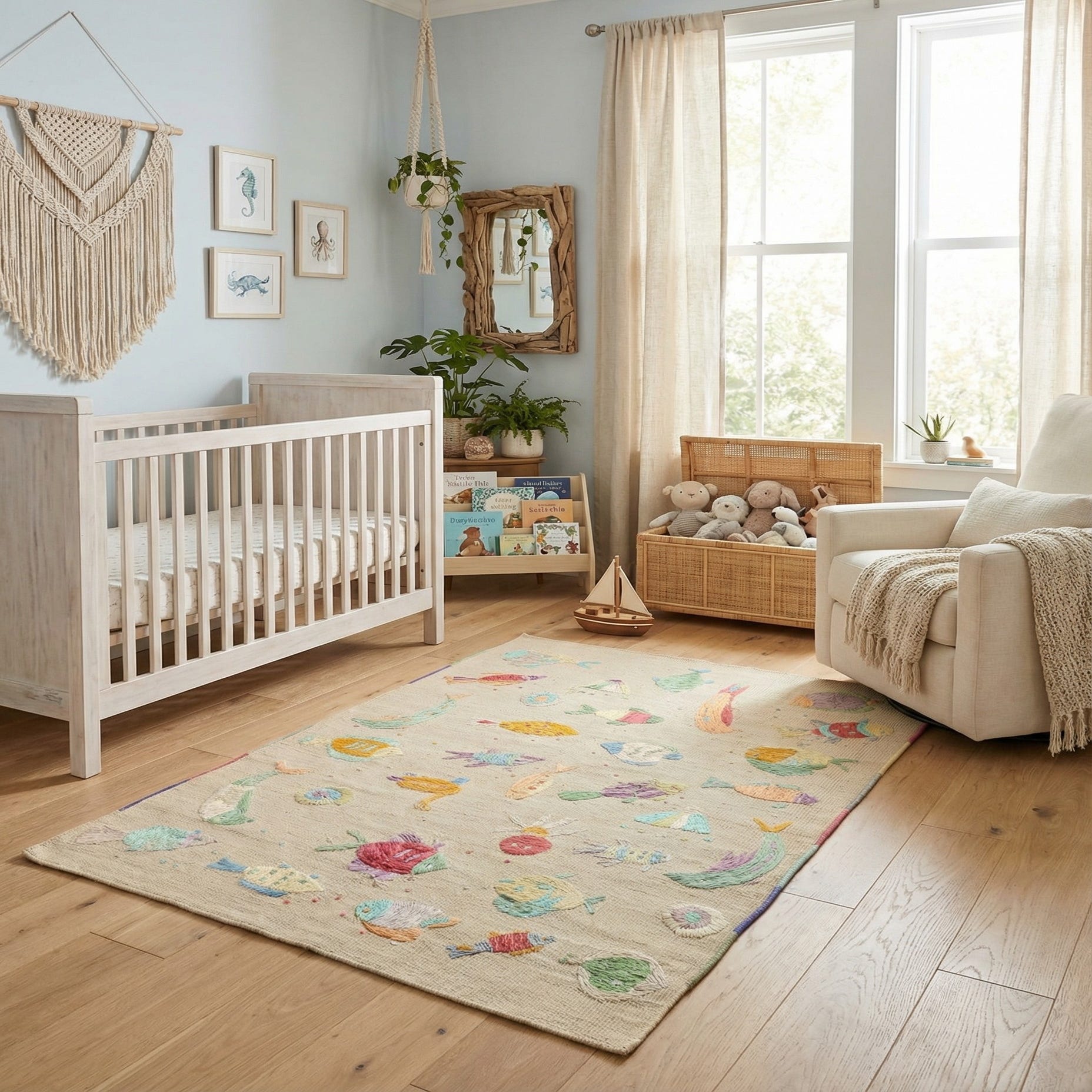 A 3x5 rectangular ivory flatweave rug features a playful, colorful tribal pattern of embroidered fish and sea creatures.