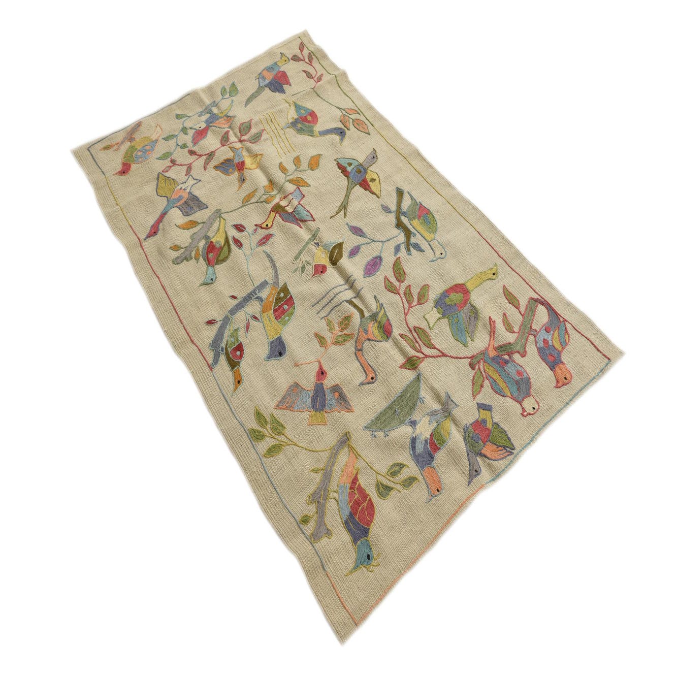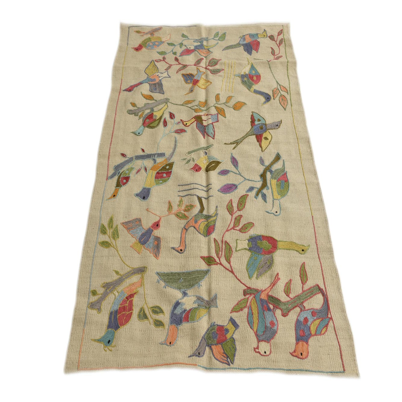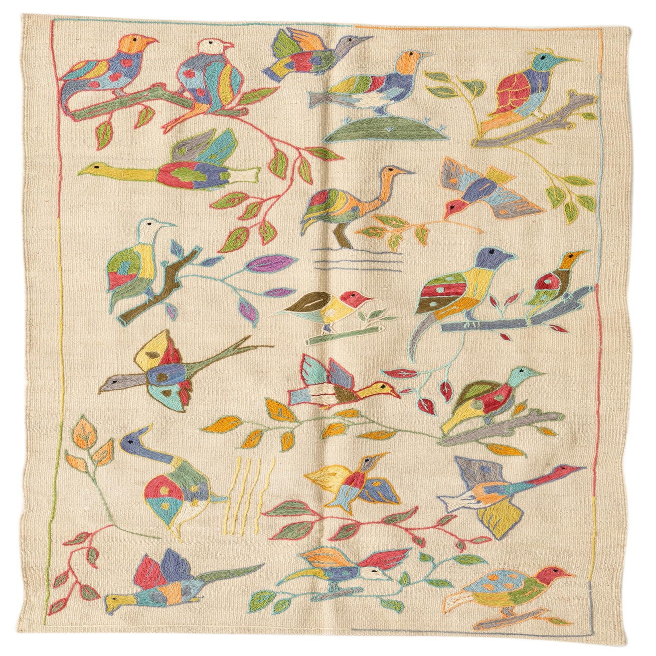 An ivory field forms a soft, neutral backdrop for a lively arrangement of bird motifs and looping branches worked in cheerful tones of blue, green, red, yellow, orange and olive. The design reads like hand-stitched embroidery laid across a flatwoven ground: the background is smooth and low-profile while the colorful birds and leaves sit slightly raised, offering gentle texture underfoot. Hand woven of 100% wool, the piece has a warm, tactile quality—wool’s natural resilience gives the weave a firm but pleasant feel you can sense when you run your hand over the surface.