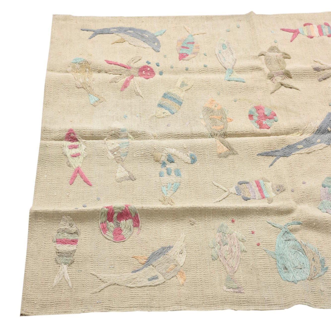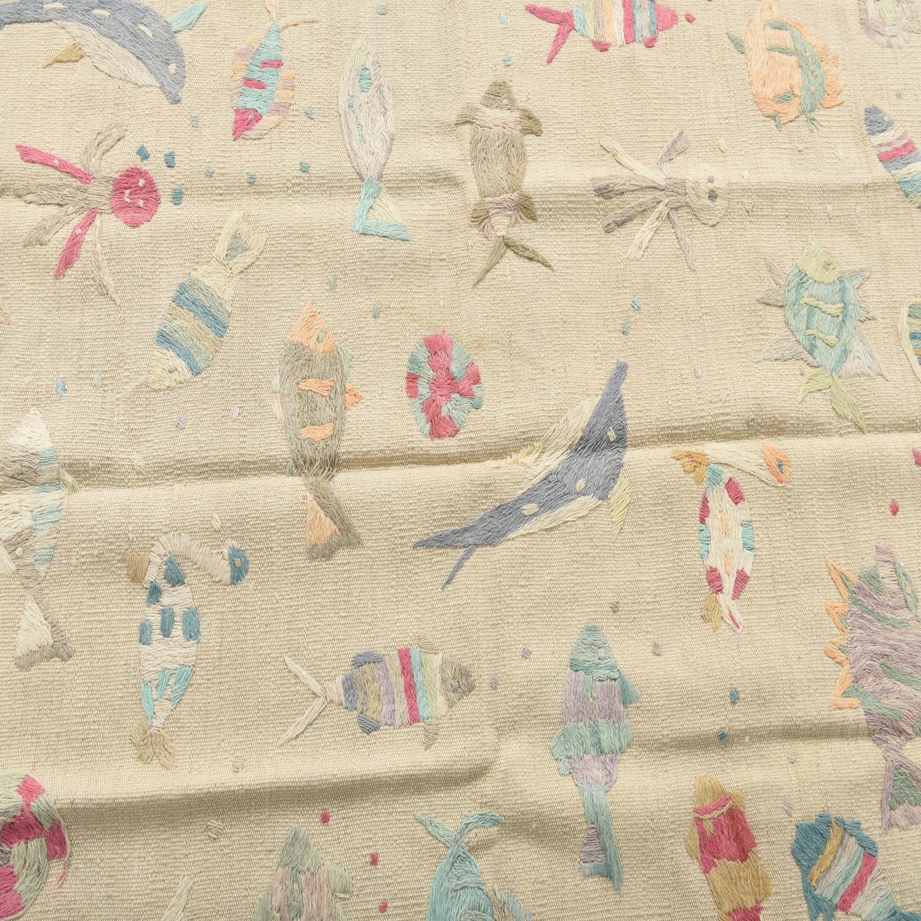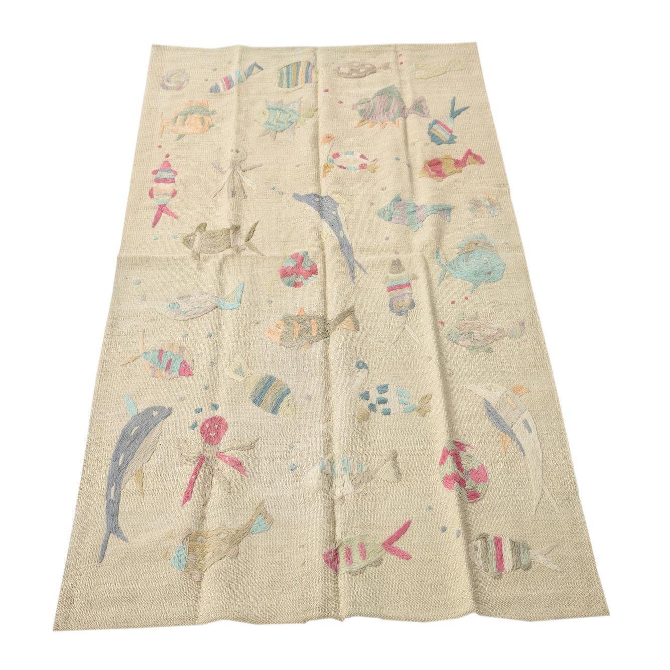 A 3x5 rectangular ivory flatweave rug featuring colorful, whimsical fish and sea creature motifs in various pastel shades, perfect for a child's room.