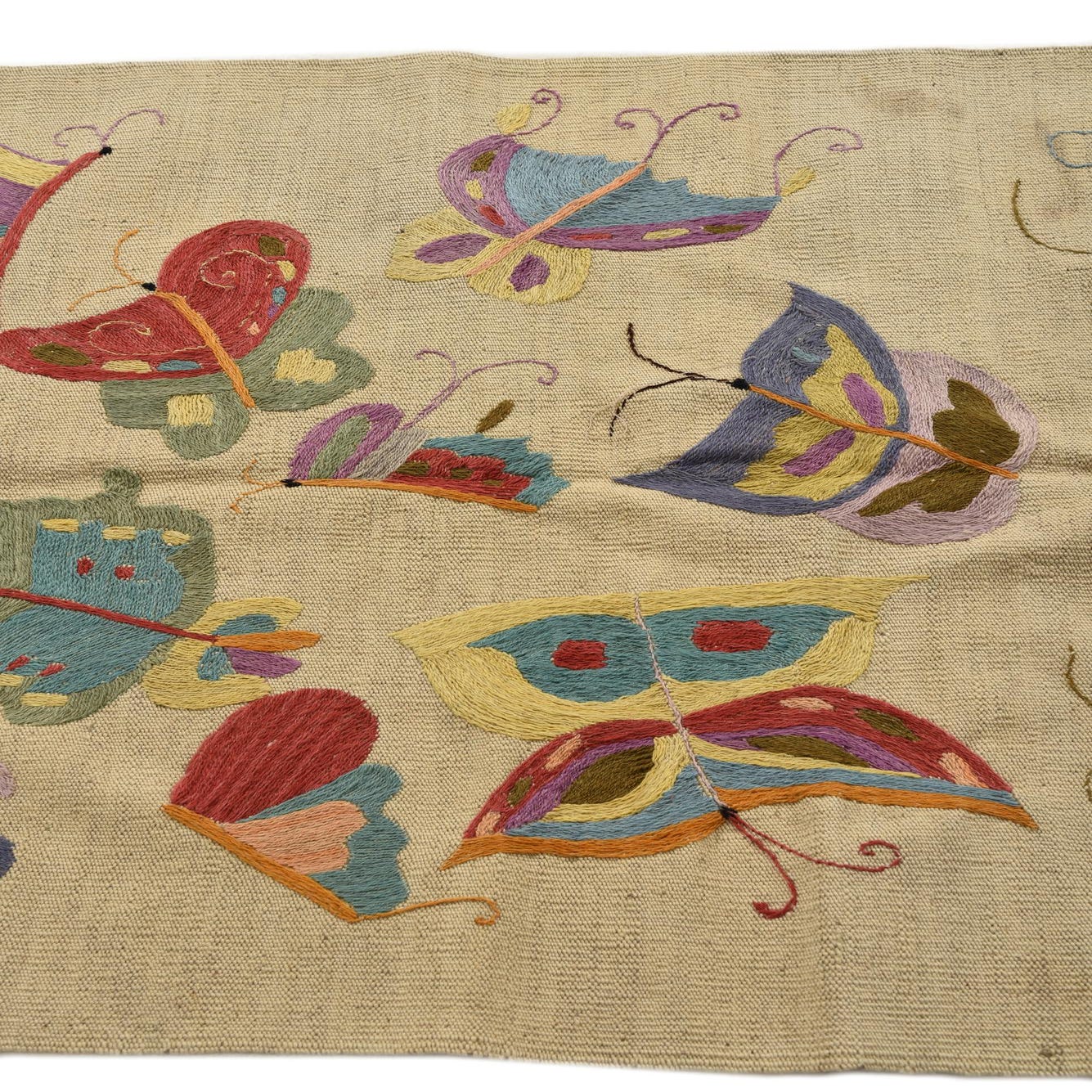 A 3x5 rectangular ivory flatweave rug featuring a vibrant, multicolored butterfly pattern in a tribal, modern style.