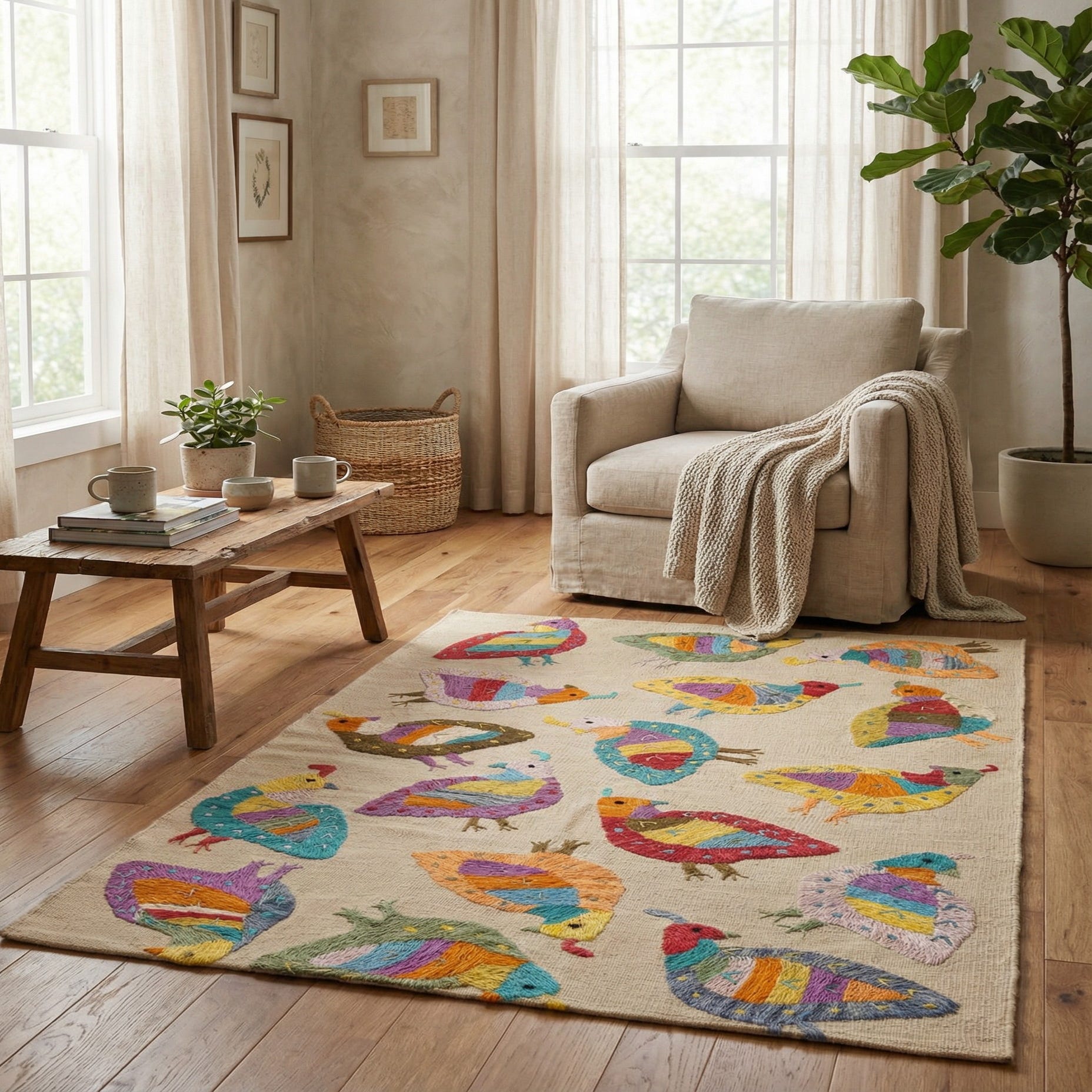 Primary color is Ivory. Colors in this rug include: Ivory, Beige, Black, Blue, Brown, Burgundy, Yellow, Light Blue, Light Brown, Light Green, Light Salmon, Tan, Teal, Terracotta, Turquoise, Red, Purple, Pink, Gold, Gray, Green.