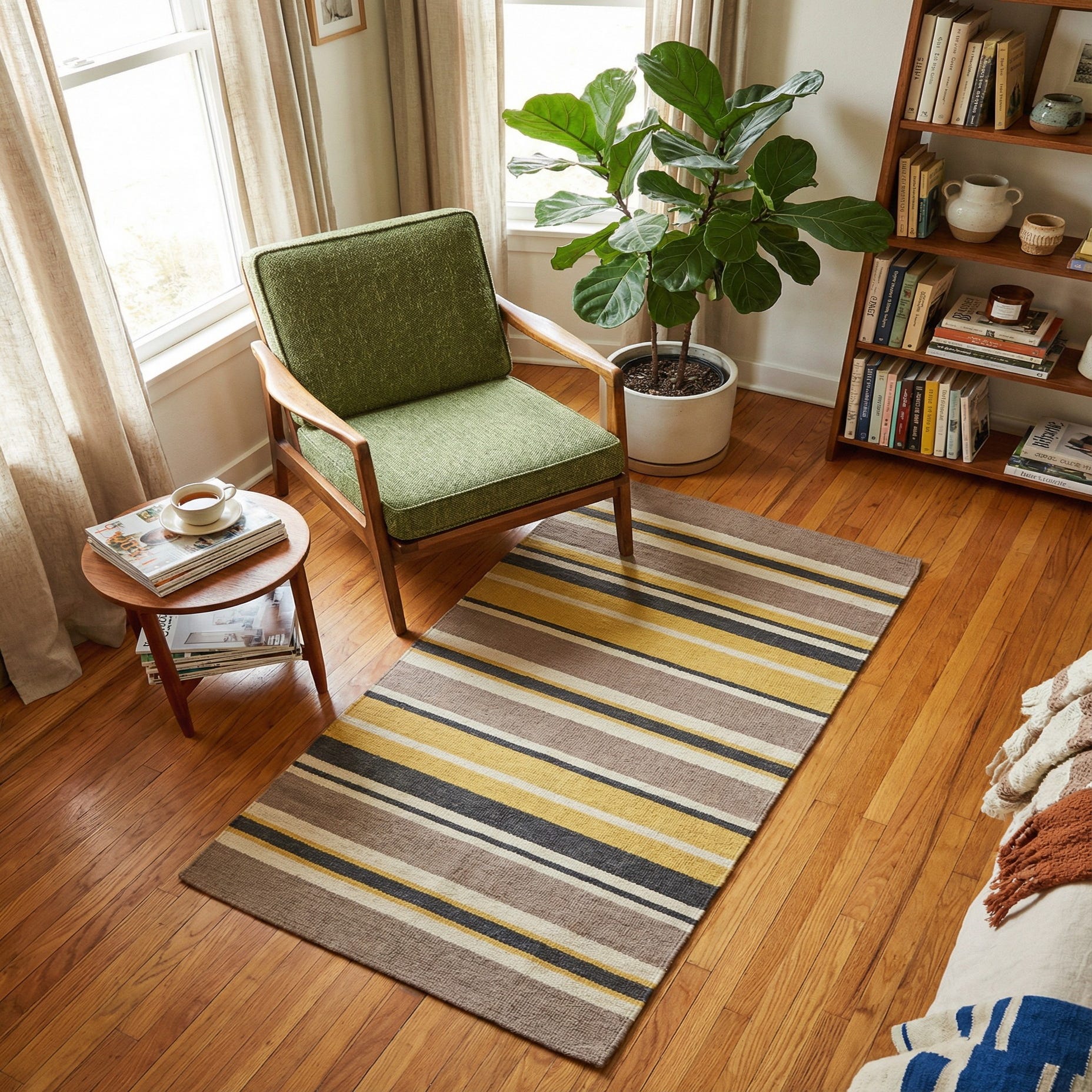 With its combination of soft wool texture and a contemporary stripe motif, this rug is well-suited for a variety of interior design scenarios. It can serve as a subtle yet stylish foundation in minimalist and Scandinavian-inspired spaces, or it can add a warm, textural element to more traditional decors. The refreshing yellow stripe injects a pop of color that could complement accents in living areas, home offices, or bedrooms seeking a hint of vibrancy without overwhelming the space.
