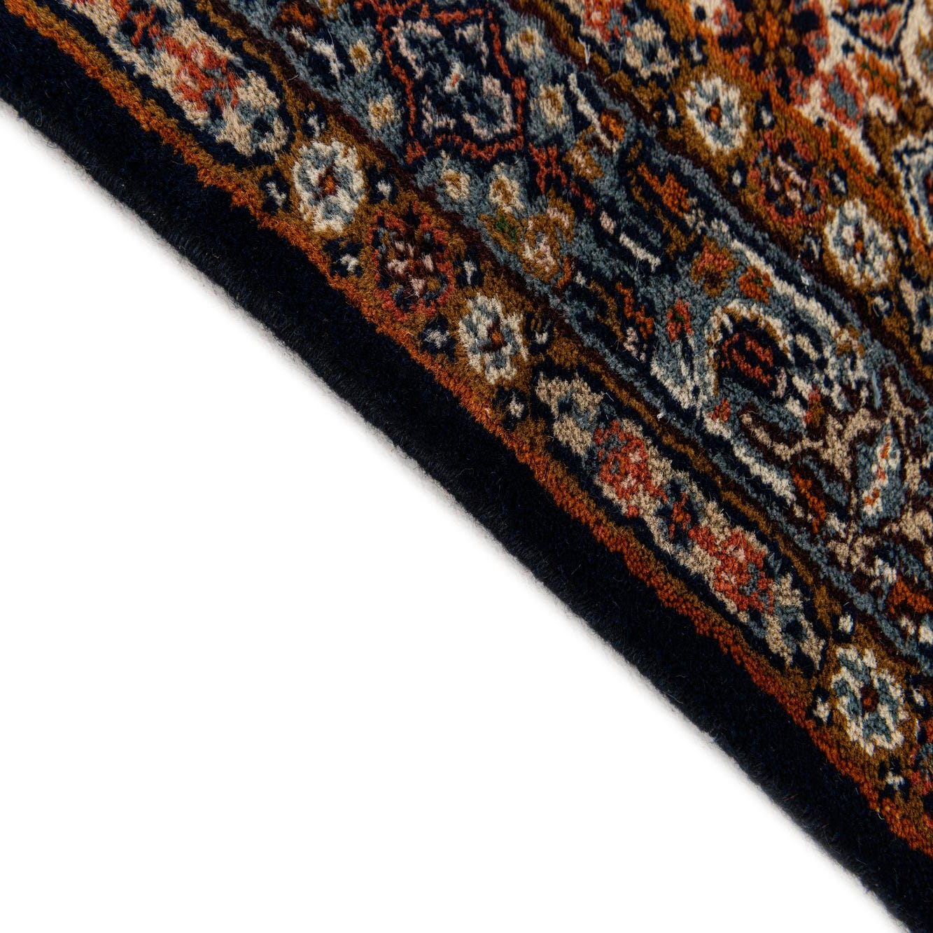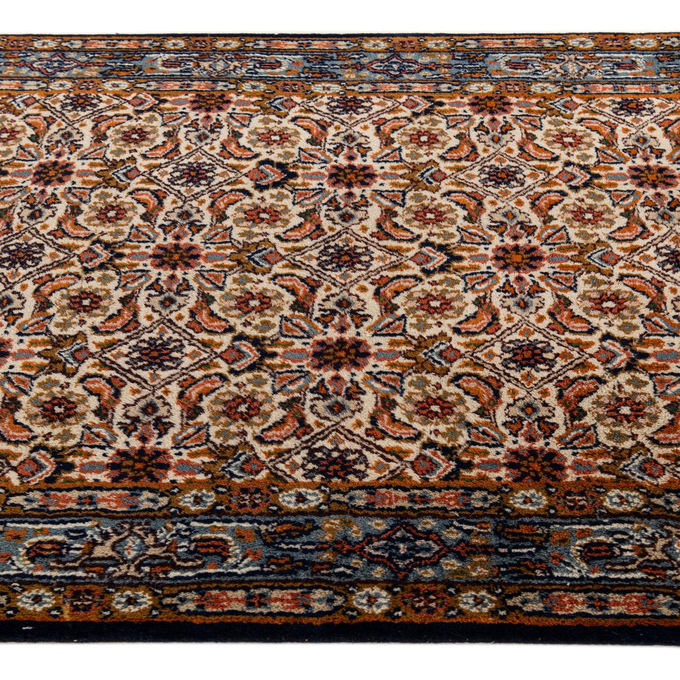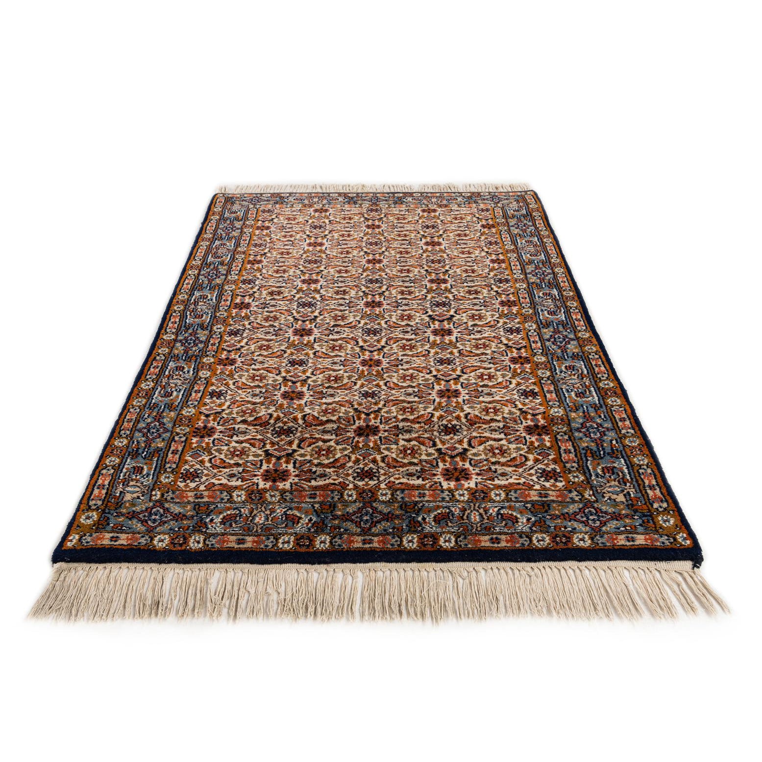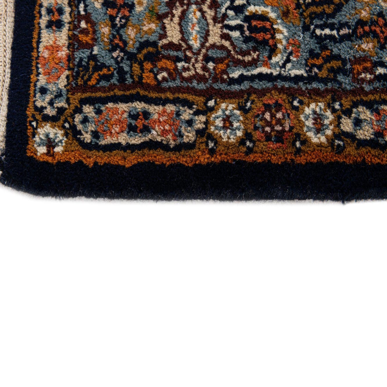 A 3x5 rectangular ivory and cream wool rug with a traditional Oriental pattern and navy blue border, featuring intricate floral and geometric motifs.