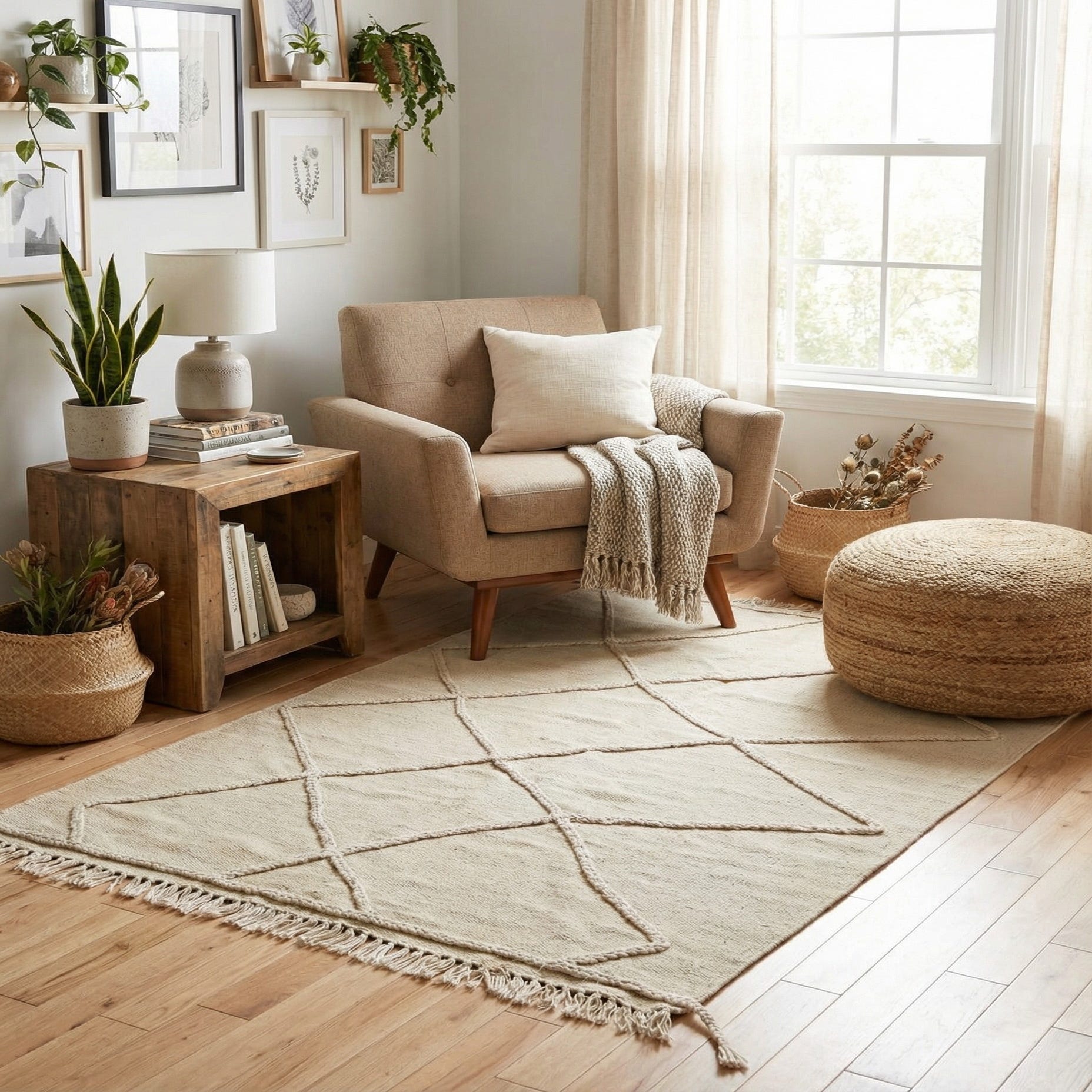 This piece's simplicity and elegance make it a fitting addition to interiors that lean towards minimalism or Scandinavian-inspired themes. Moreover, its neutral tone and understated design allow for easy integration into a bohemian or eclectic setting, where it can serve as a grounding element amid more vibrant decor elements. In a contemporary or modern farmhouse setting, this rug will contribute texture and warmth, enhancing the inviting atmosphere of the room.