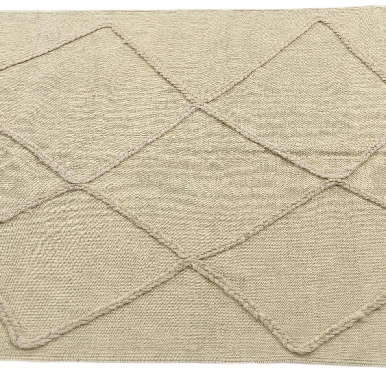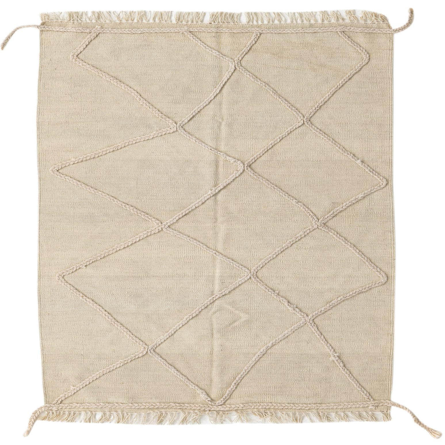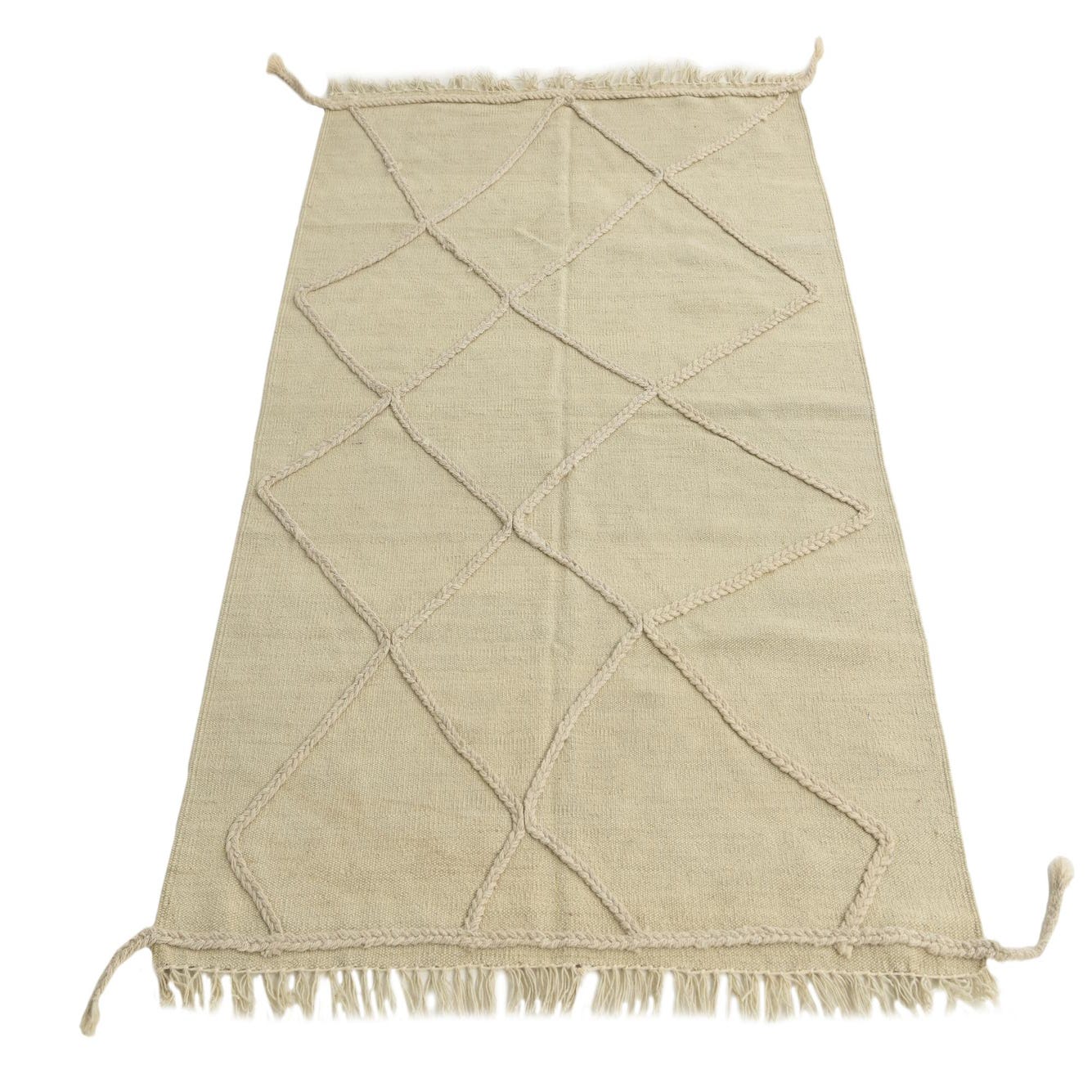A 3x5 rectangular ivory wool shag rug with a raised braided diamond pattern and fringed edges.