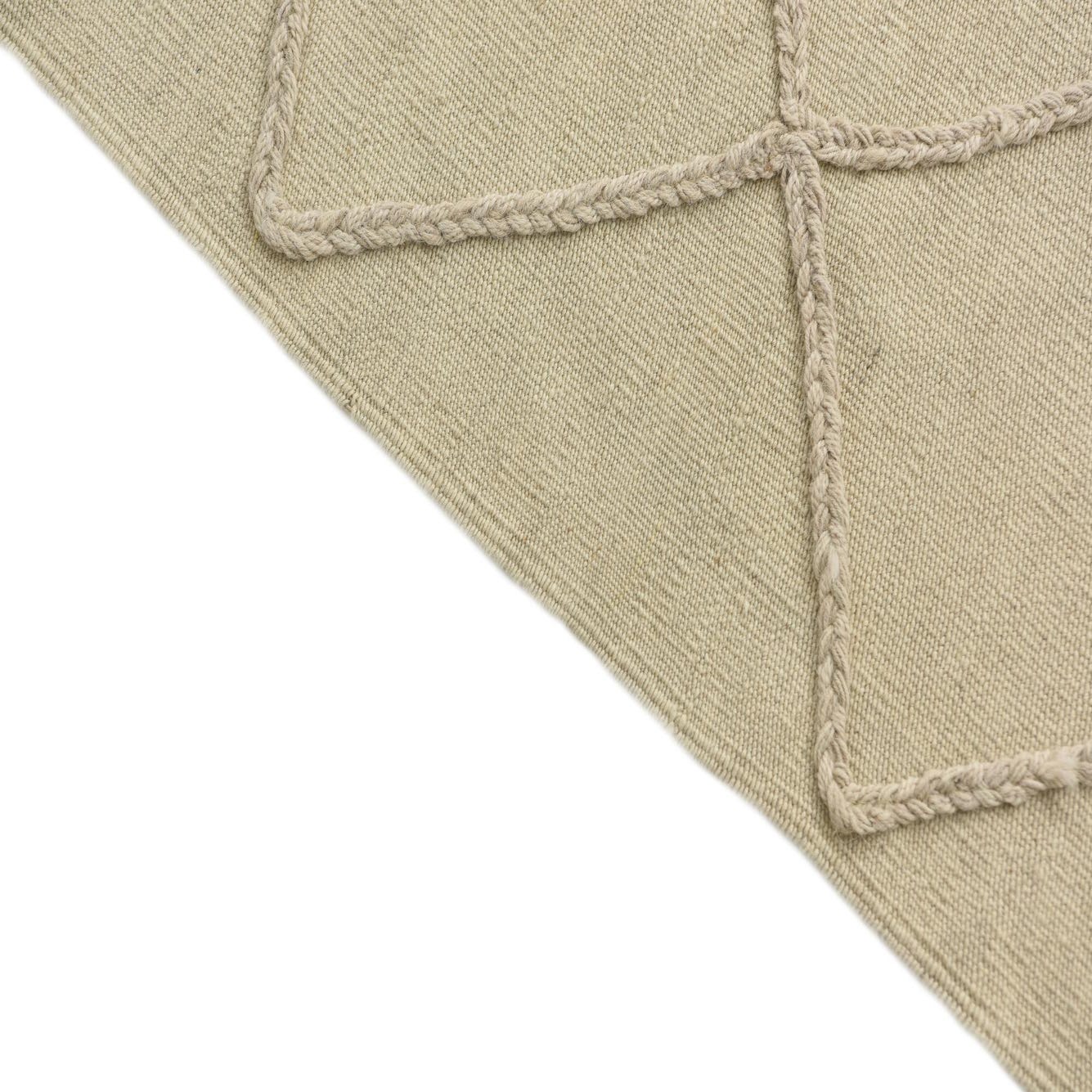 The design showcases a neutral ivory background, accented with a geometric diamond lattice pattern. The contrast of the pattern against the base color adds subtle visual interest without overwhelming the space. The fringe detailing on either end provides a traditional finish that complements the rug's overall aesthetic.