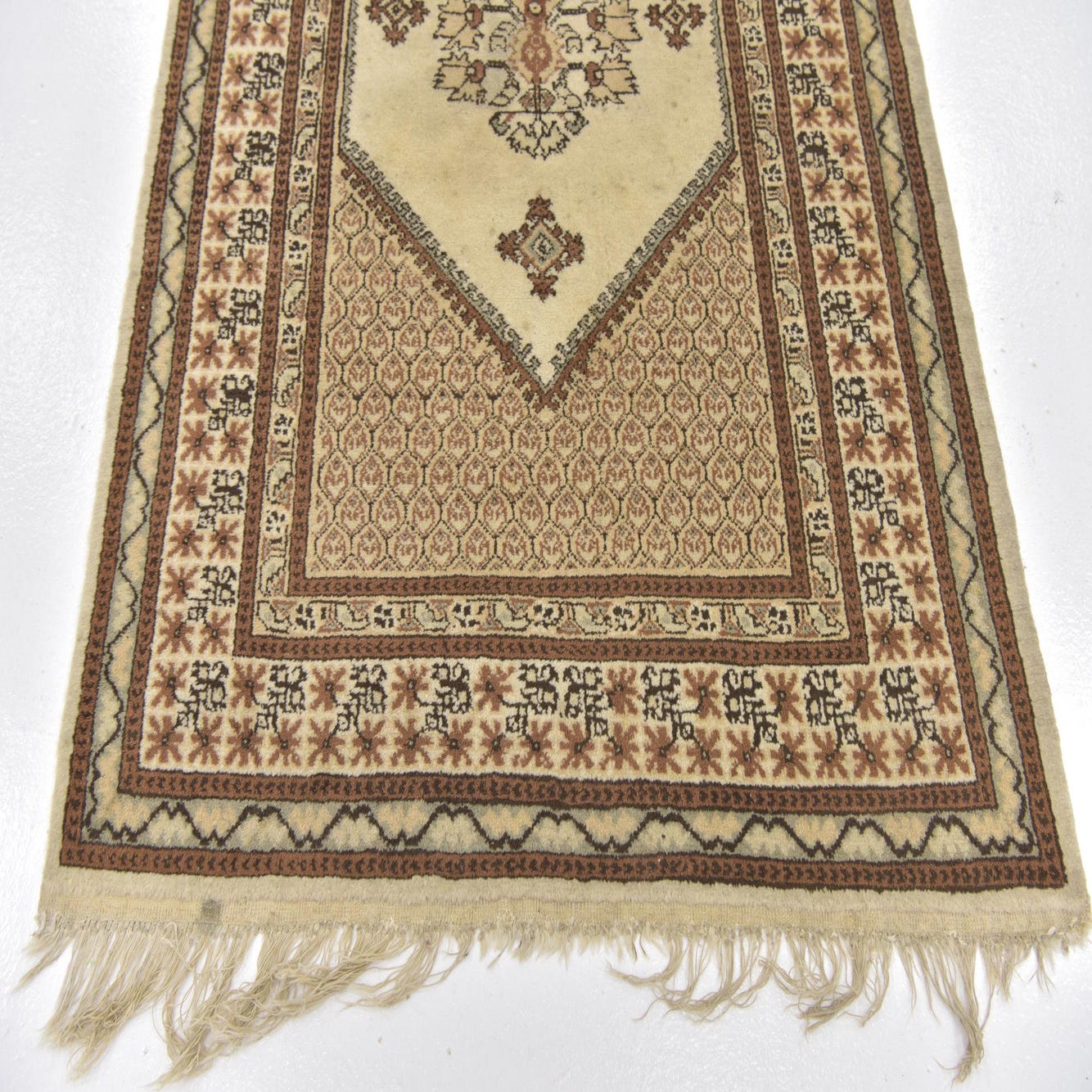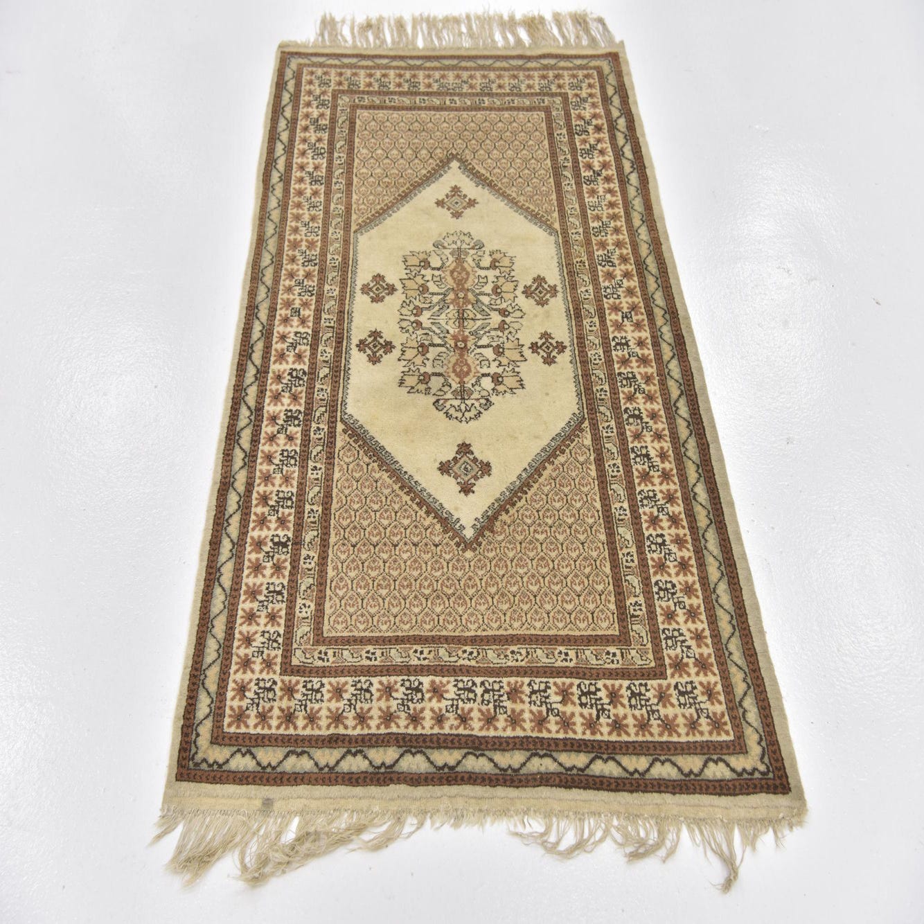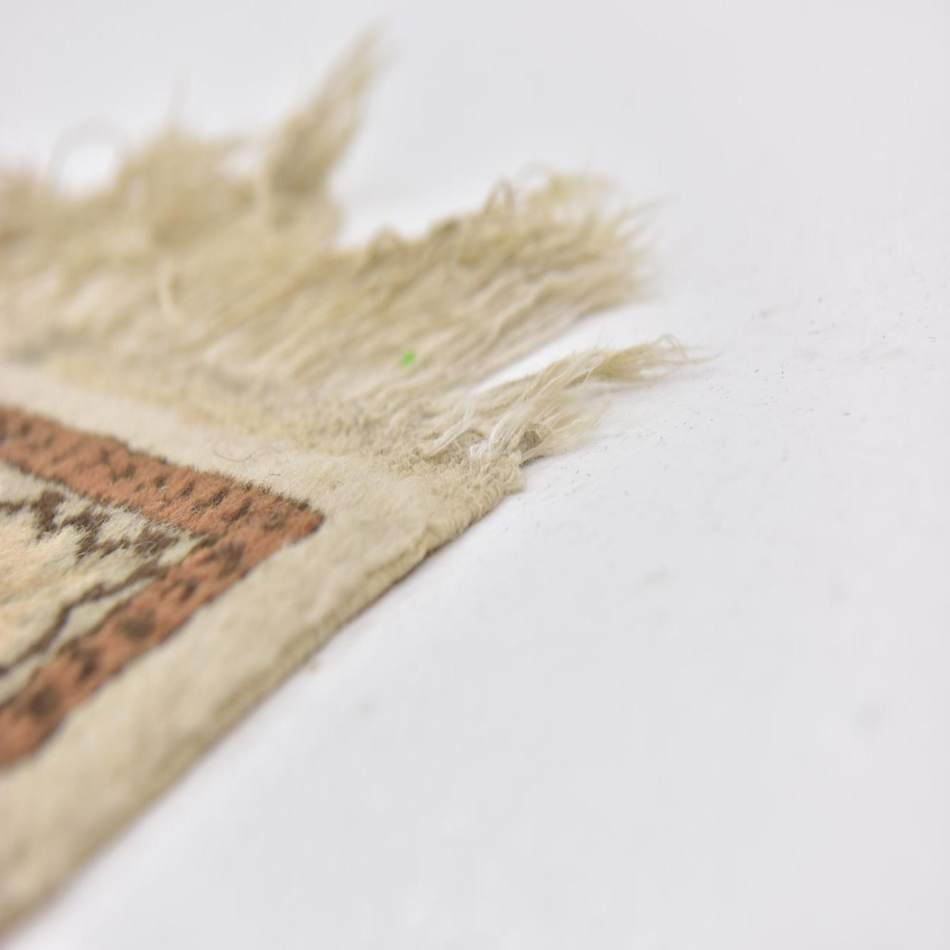 The 3x5 size works comfortably in a variety of settings, from smaller living spaces to large rooms as an accent piece. With its semi-antique status, the rug possesses unique character, including low pile spots and missing fringe, which add to its authentic charm. Despite these seasoned traits, the rug retains a timeless aesthetic appealing to both traditional and contemporary decor.
