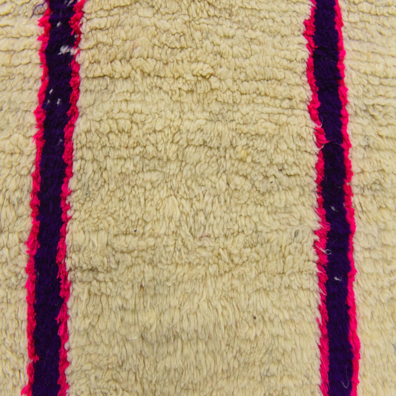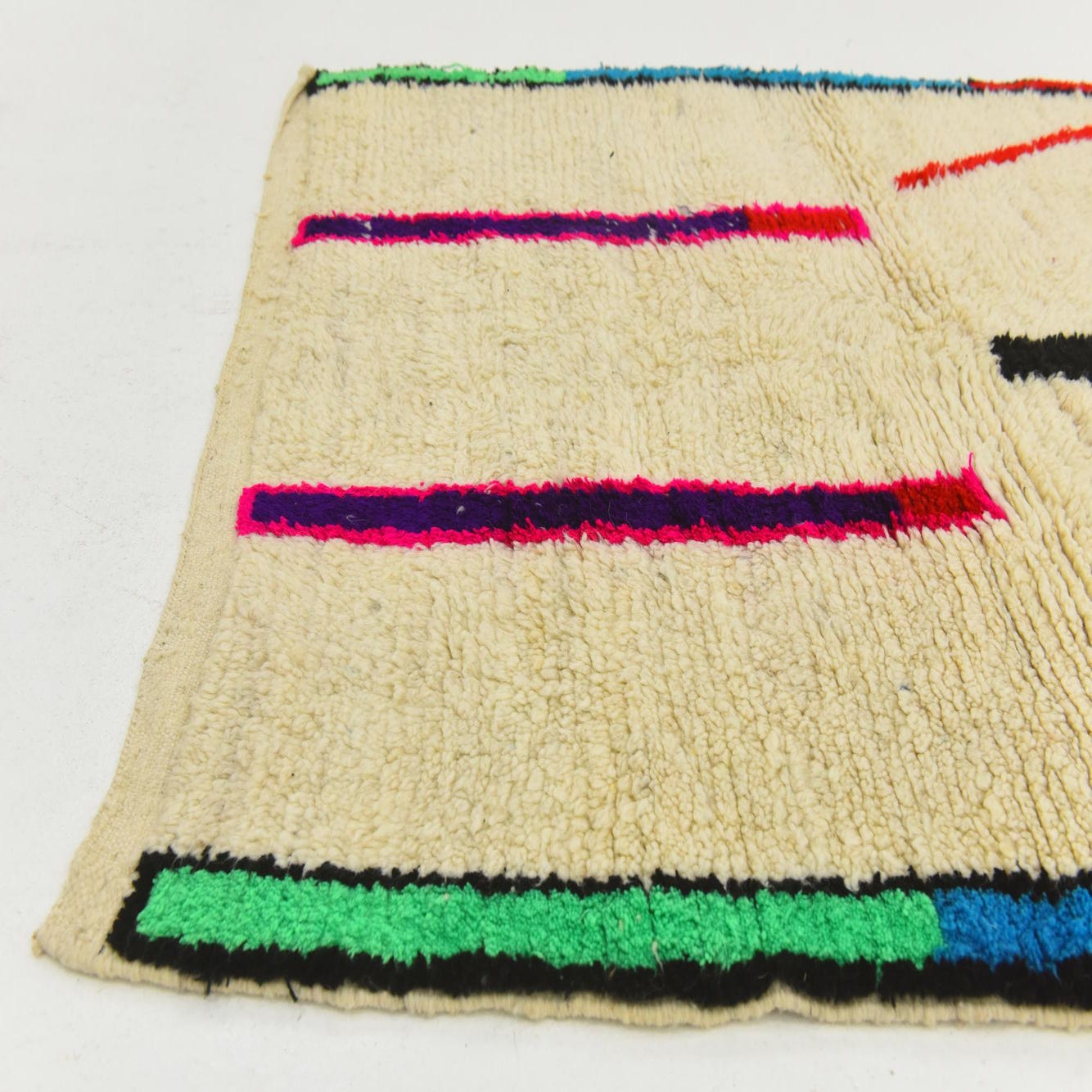 This Moroccan collection rug presents a hand-knotted weave of 100% wool, offering a tactile texture that is both soft and durable. The rug measures 3x5, making it a versatile size for a variety of spaces. The ivory background provides a subtle canvas for a series of linear patterns in a striking color palette, including black, blue, green, purple, and red accents.
