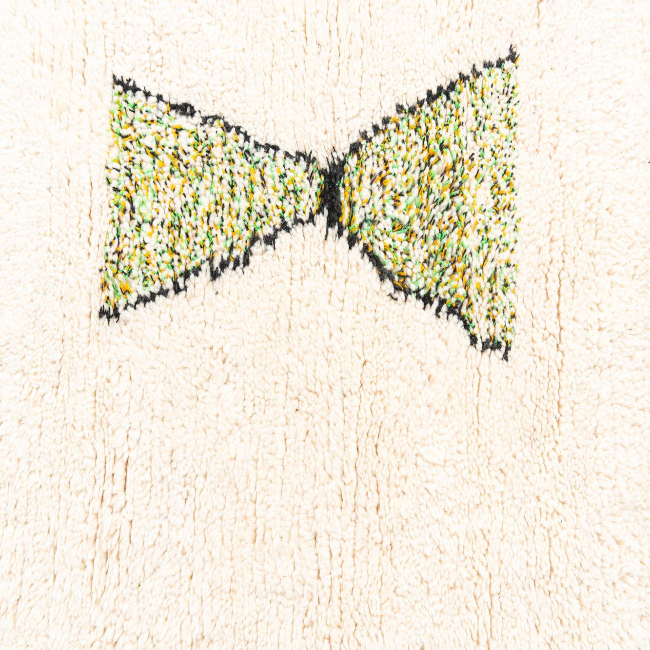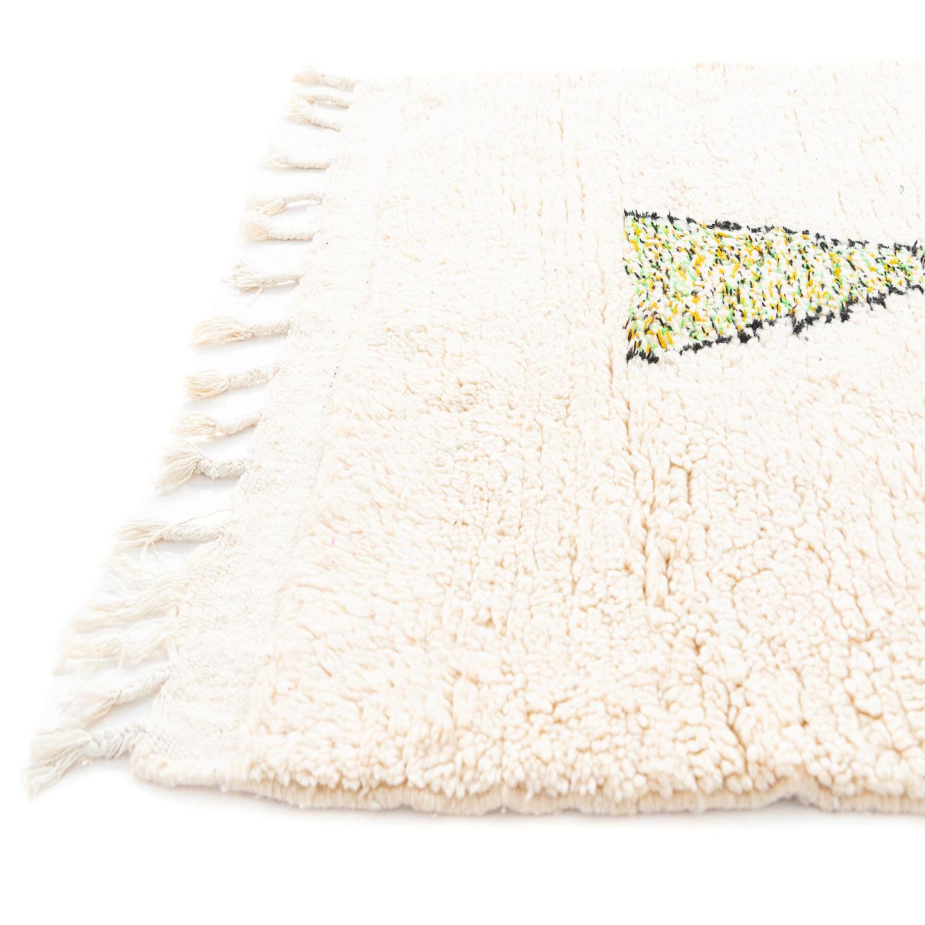 A 3x5 rectangular ivory shag rug with a central green and yellow hourglass-shaped tribal pattern, featuring tassels.