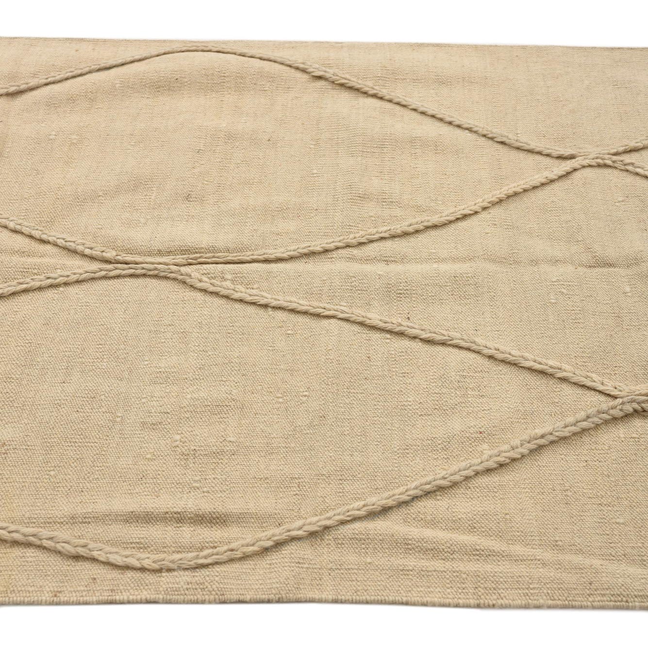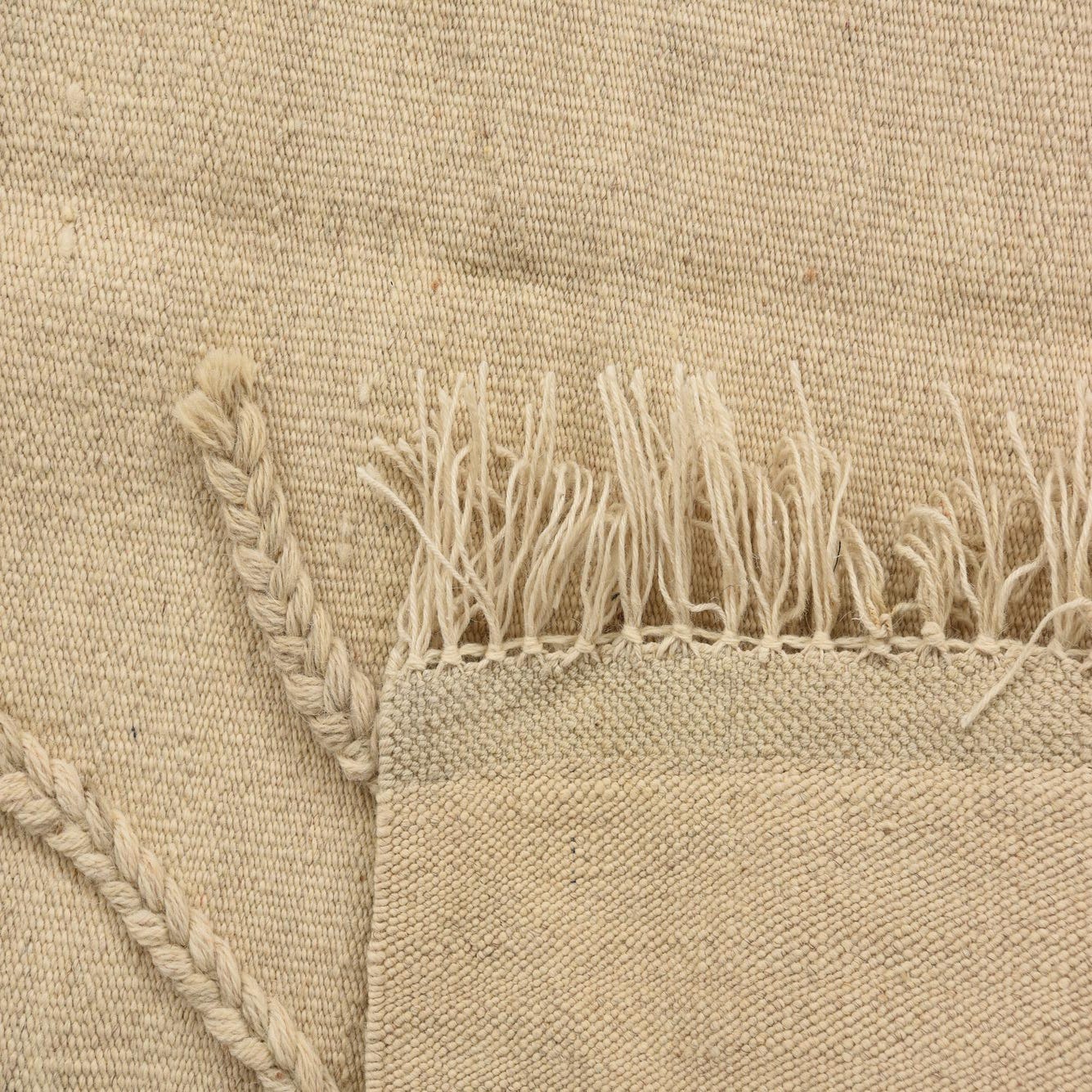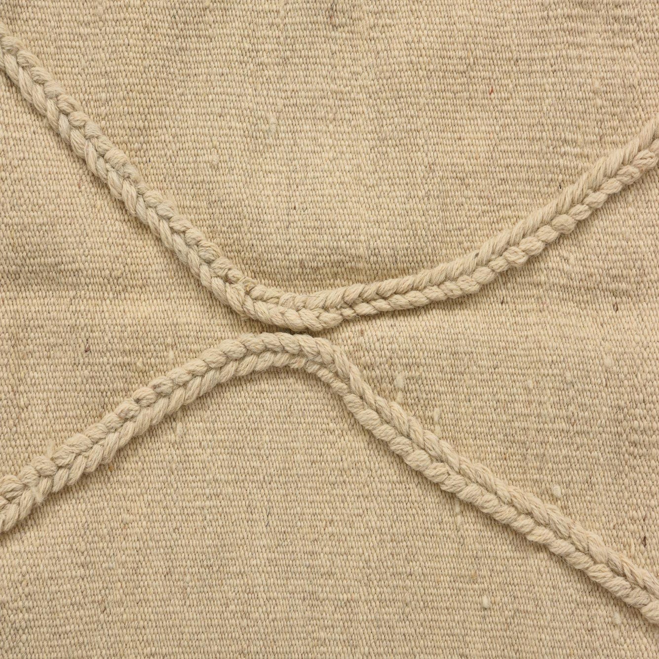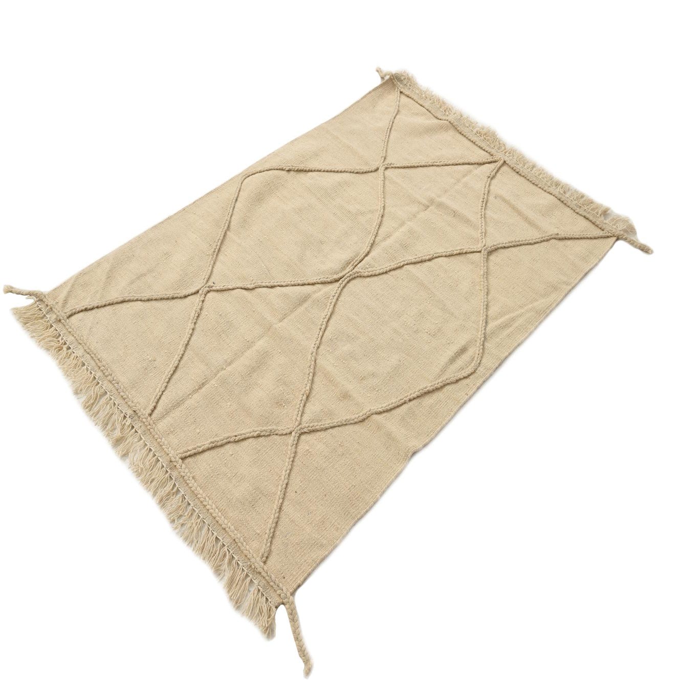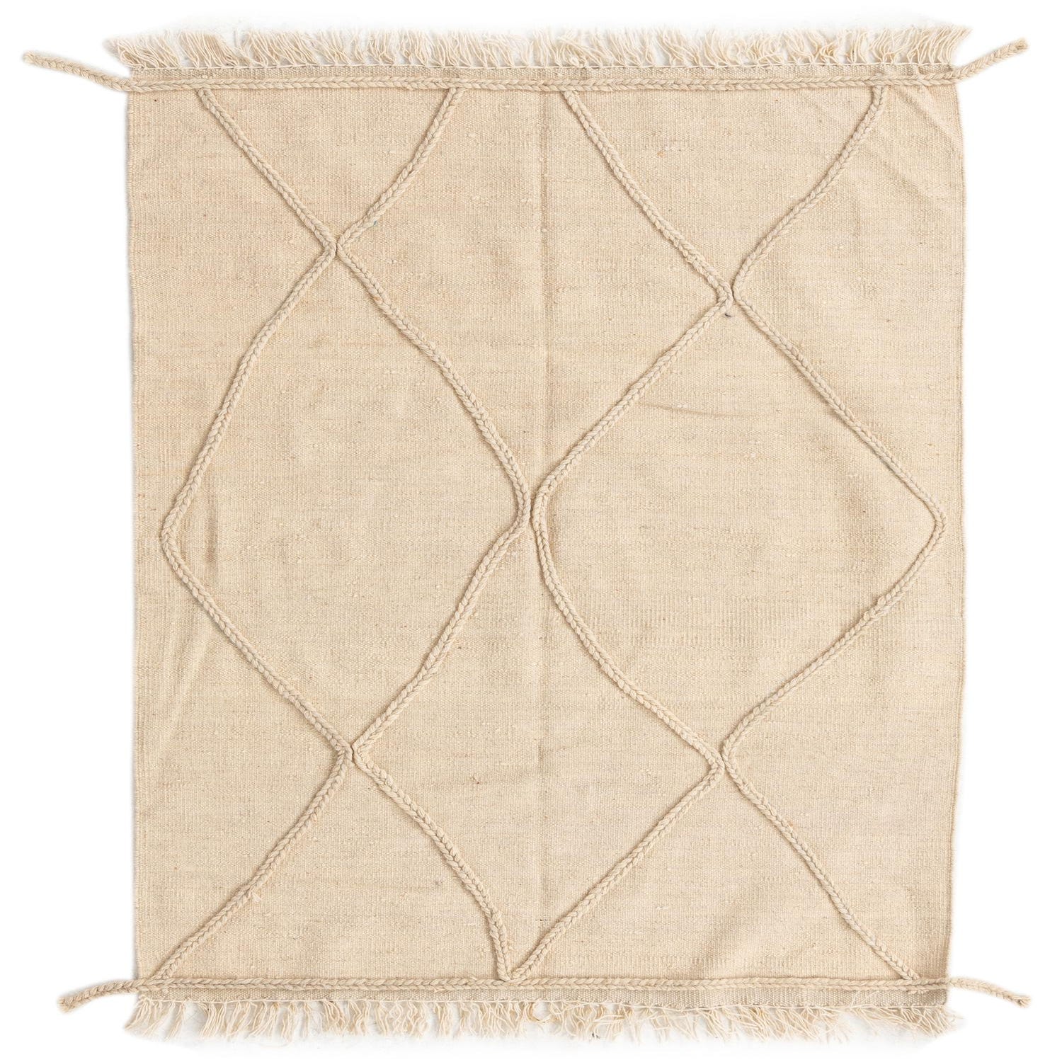 A 3x5 rectangular ivory wool shag rug with a braided diamond pattern and fringed edges.