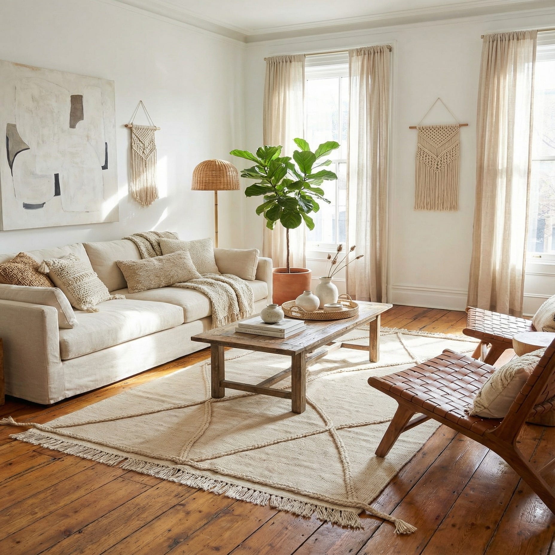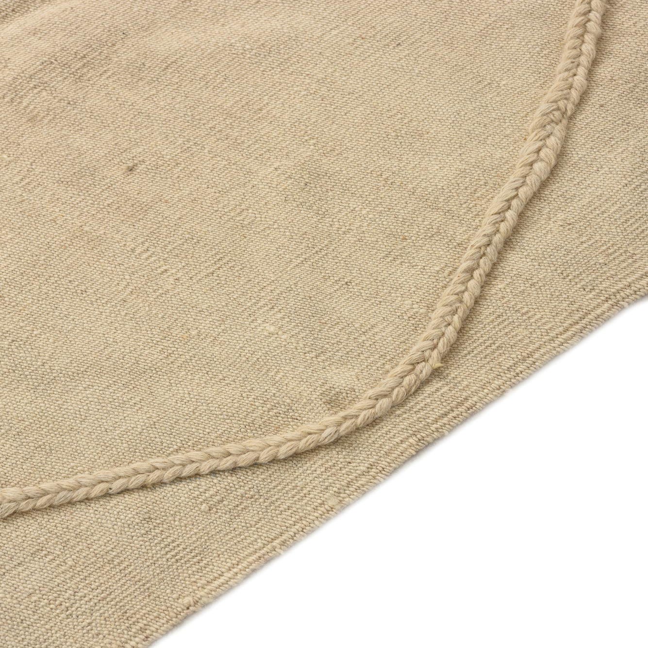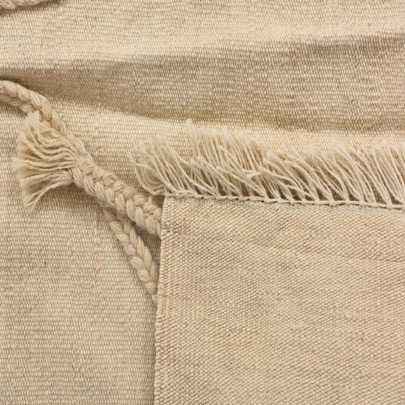 The neutral colors of this rug ensure versatility in various design settings. The fringed edges provide a hint of traditional charm, adding character without overwhelming the piece's intrinsic minimalist appeal. This rug would be an ideal choice for spaces such as a cozy reading nook, under a coffee table in a living room, or anchoring a small dining area, complementing a range of decors from Scandinavian to contemporary or even bohemian themes. It could work equally well within a monochromatic color scheme or as a calming counterpoint to more vibrant furnishings.