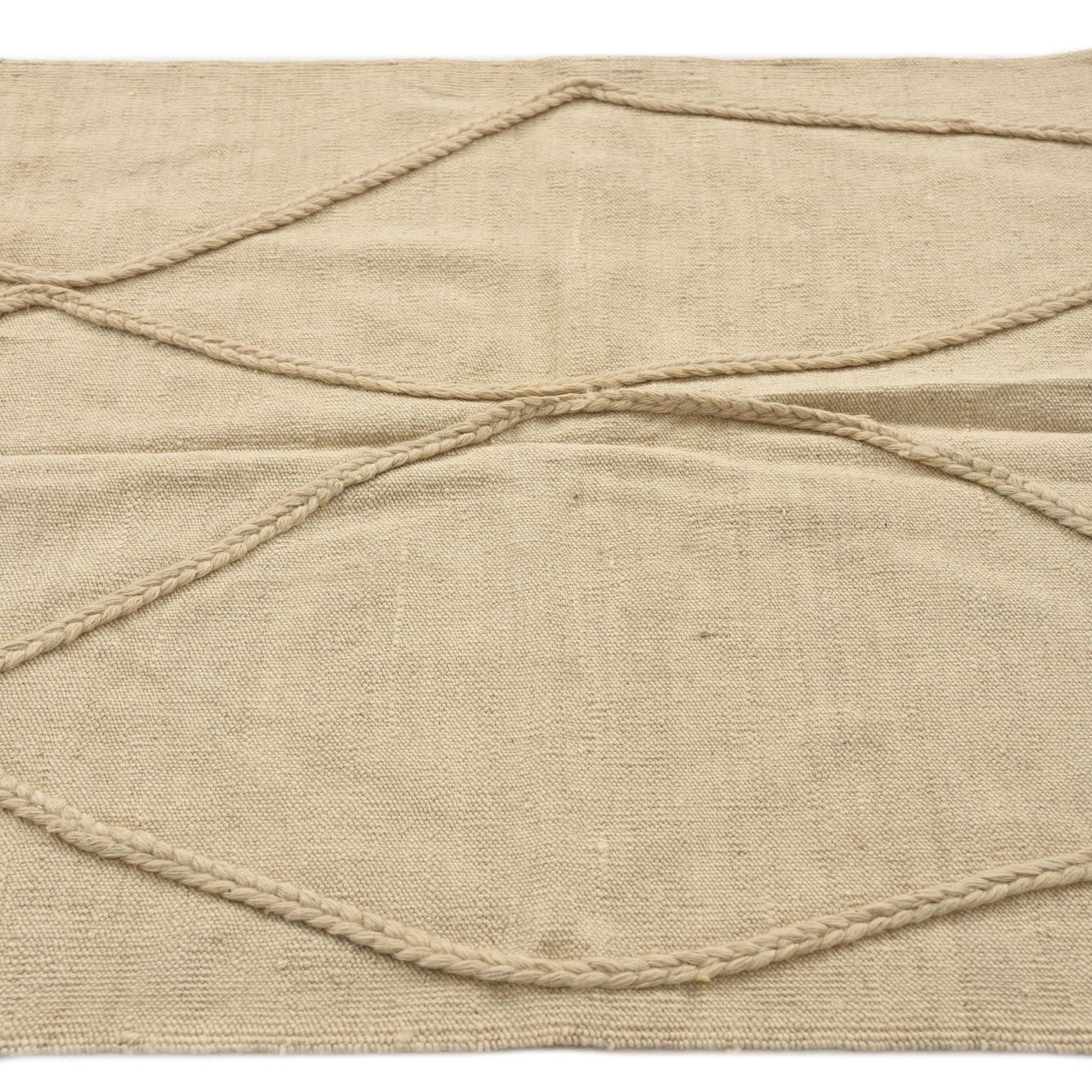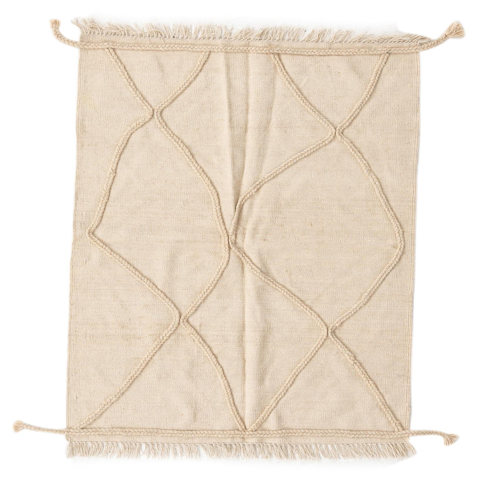 This Moroccan collection rug is a 3x5 hand-knotted piece crafted meticulously from 100% wool, yielding a texture that is both soft to the touch and durable. Its ivory background is the canvas for a simple yet alluring geometric pattern that is embossed subtly, creating a sense of dimension and an understated aesthetic.