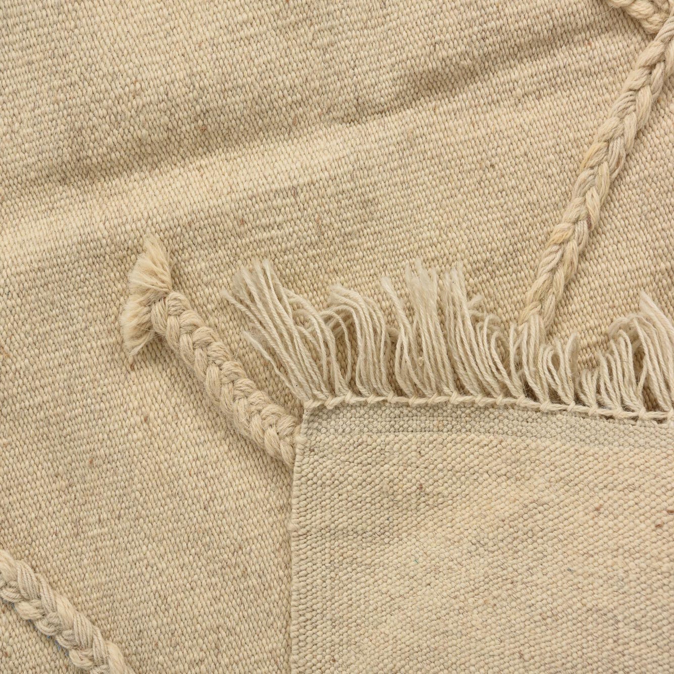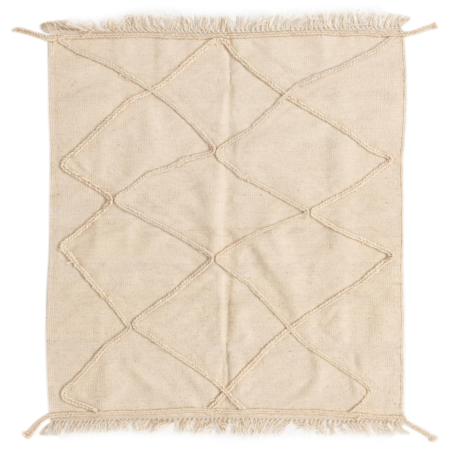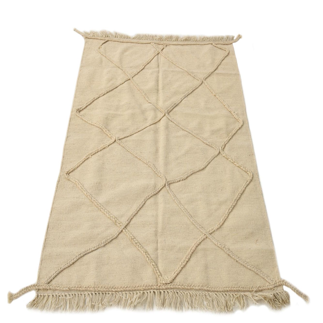 A 3x5 rectangular ivory wool shag rug with a raised braided diamond pattern and fringed edges.