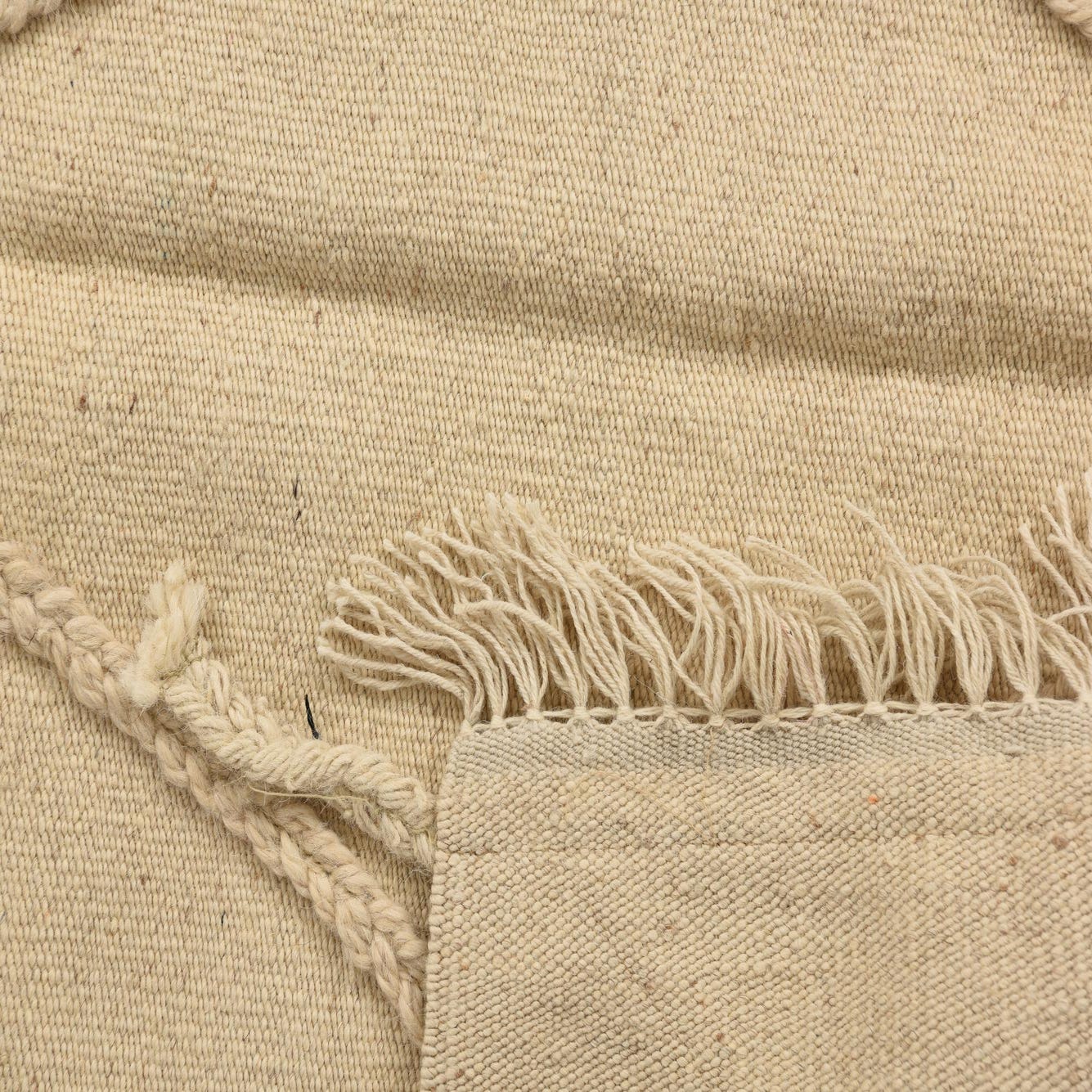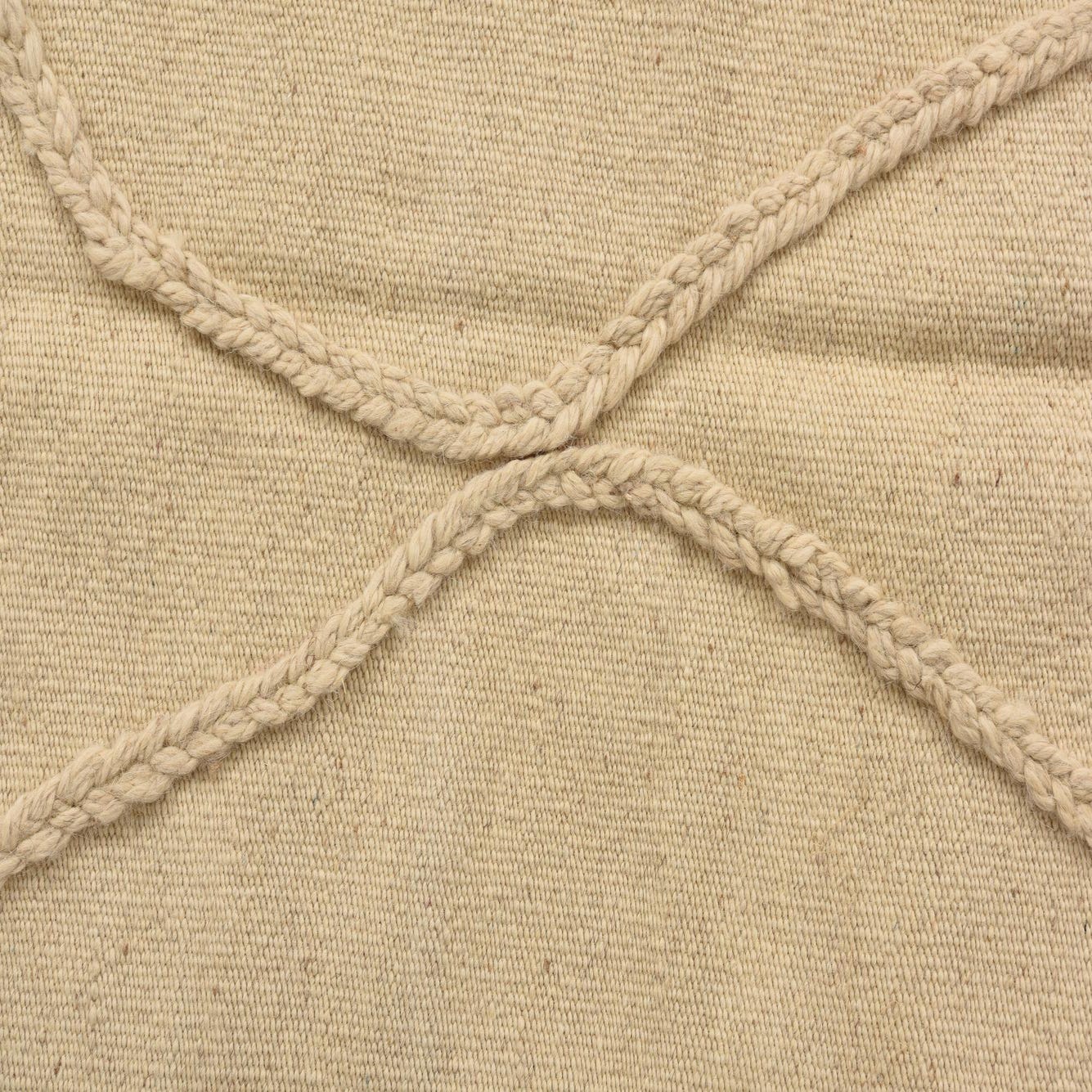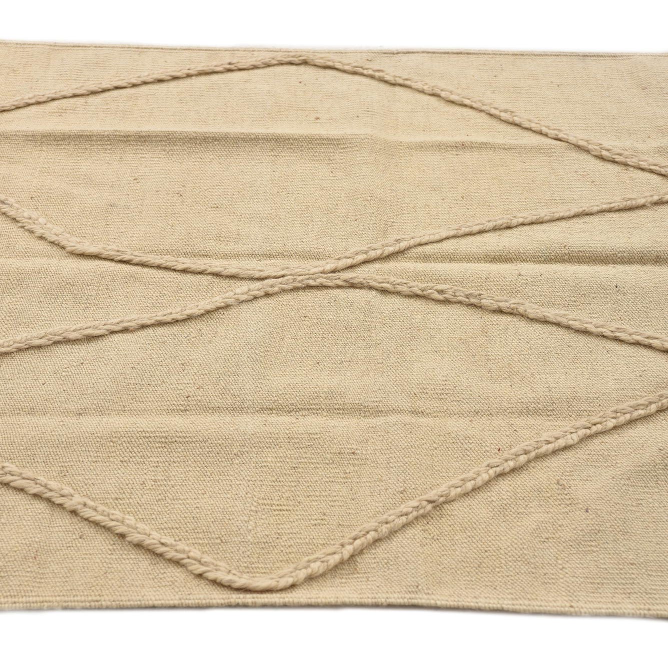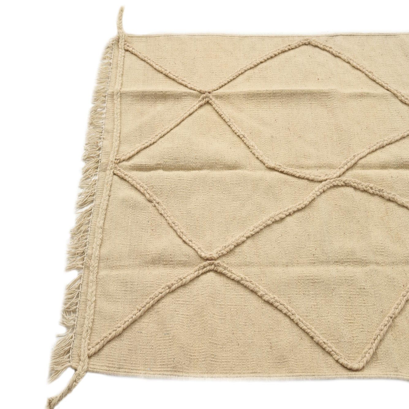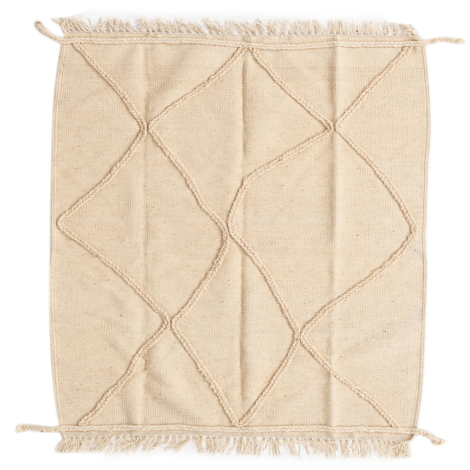 A 3x5 rectangular ivory wool shag rug with a raised tribal diamond pattern and fringe.