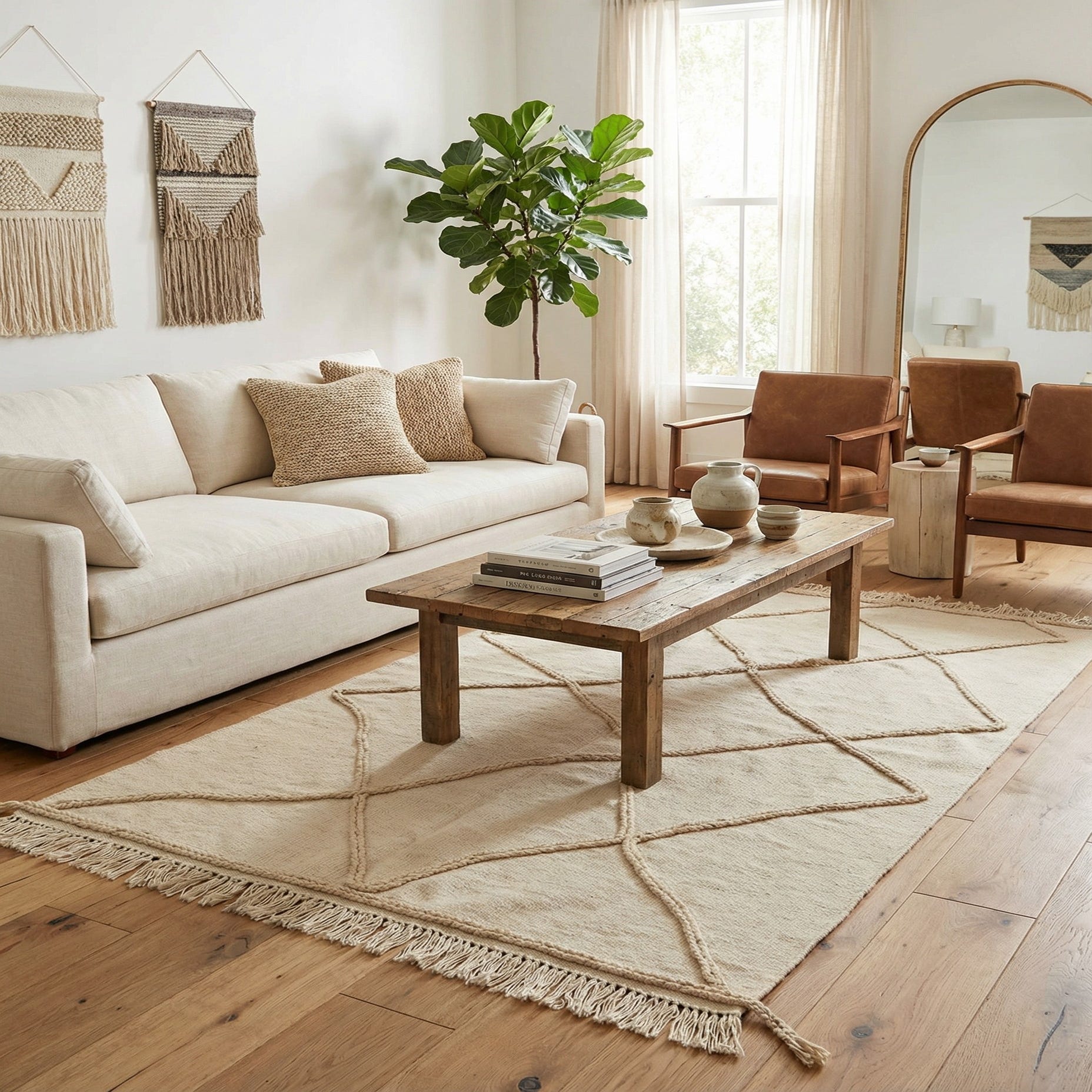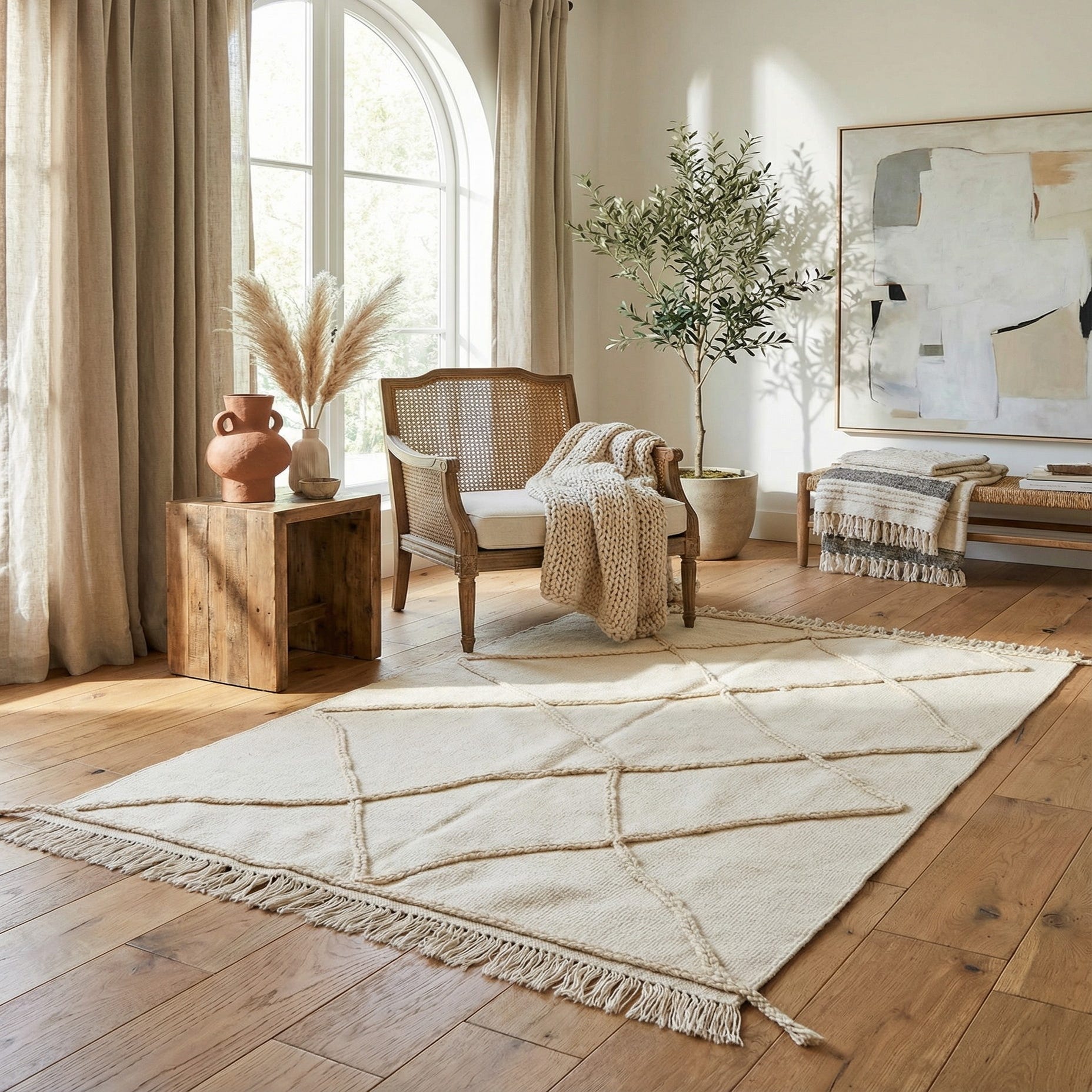 At 3x5, this wool rug is an ideal size for accentuating smaller spaces or serving as a focal point in an intimate setting. Its neutral color palette and versatile design make it suitable for a variety of interior styles, from modern and minimalist to bohemian and rustic. It can complement earthy tones and natural materials in a space, or it can serve as a subtle backdrop to more vibrant decor elements. The rug's clean geometric lines and the handcrafted quality would be particularly at home in a living area, entryway, or under a coffee table, providing both style and warmth to the interior environment.