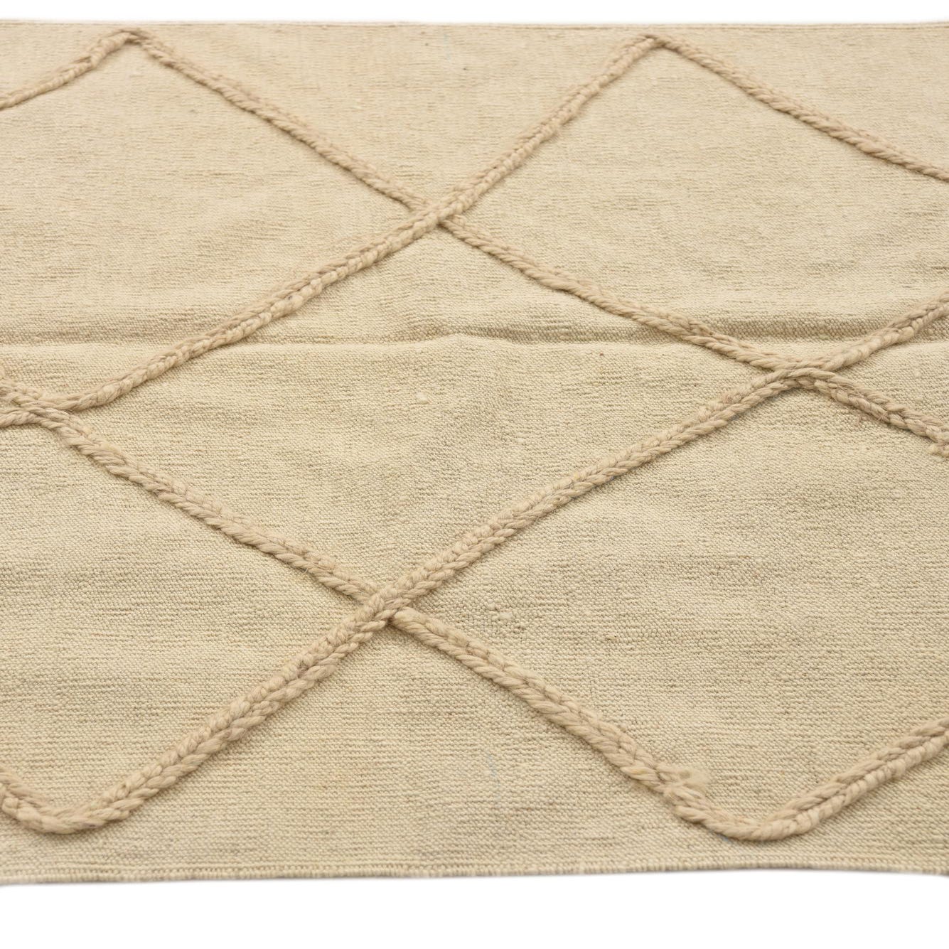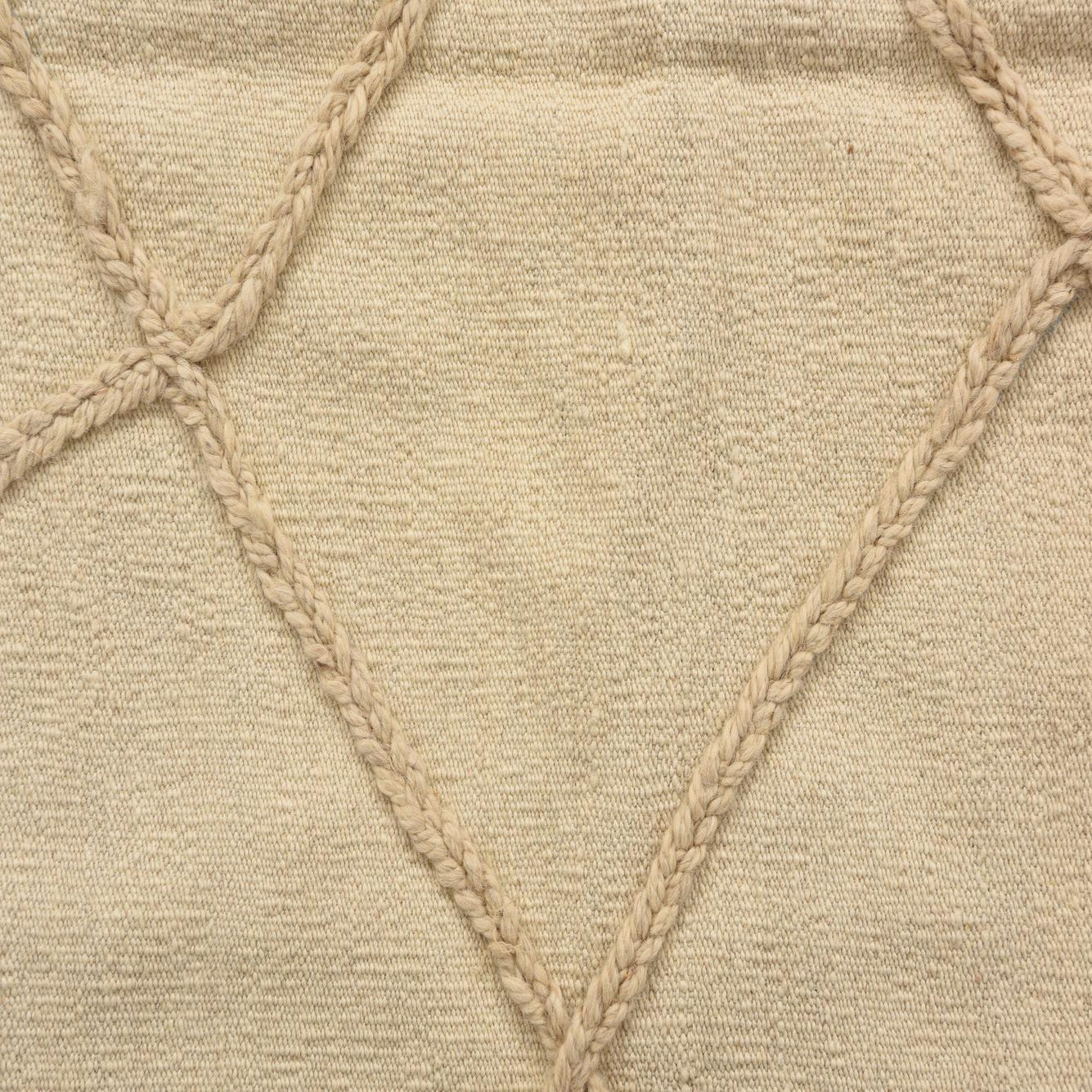 This Moroccan collection rug is a hand-knotted piece crafted from 100% wool, offering a blend of durability and tactile comfort. The rug features a simplistic yet engaging pattern with a series of diamond shapes created by intersecting lines in a tan hue, set against an ivory background. The contrasting textures within the design add depth and interest to the rug, while the inclusion of fringe on the ends provides a classic finish.