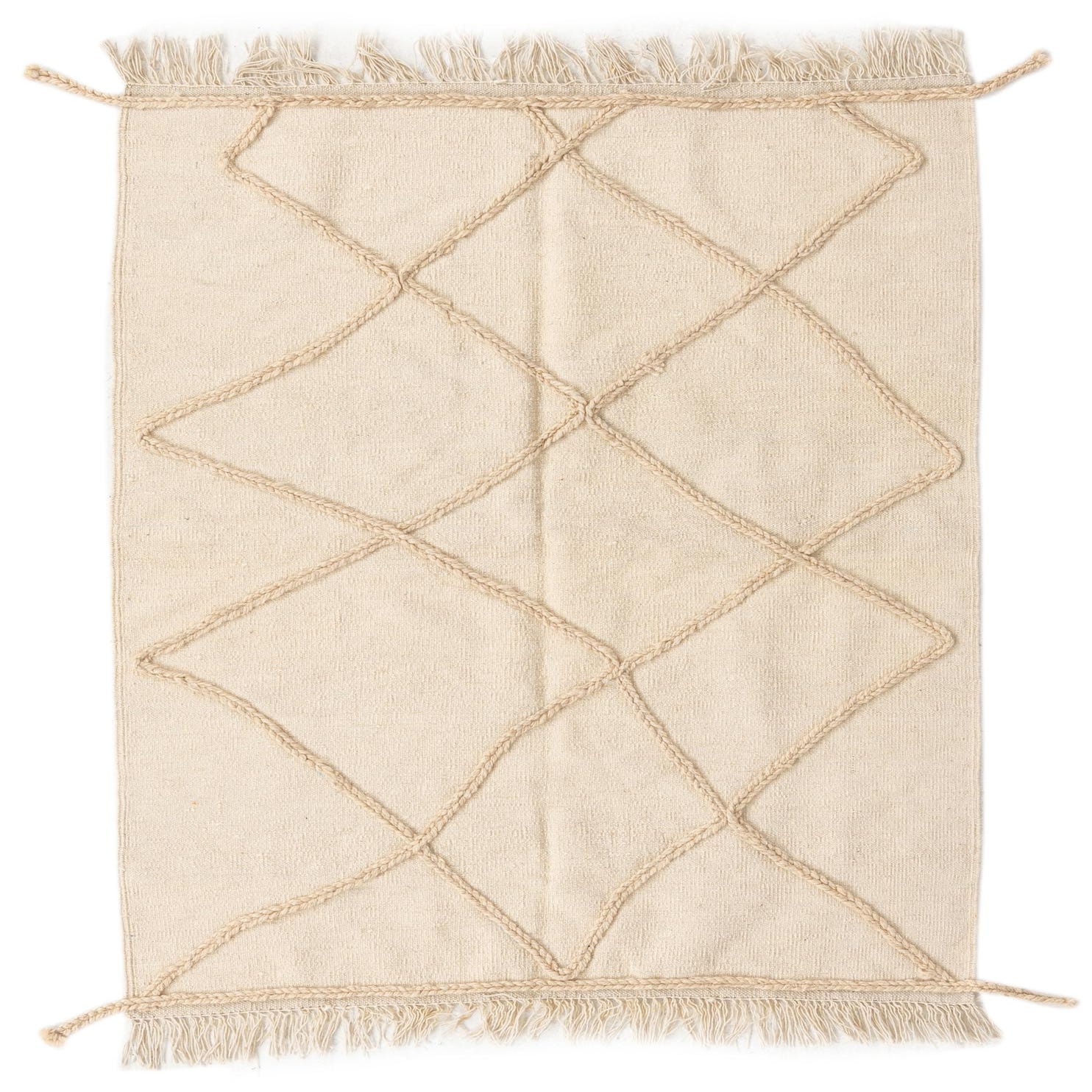 A 3x5 rectangular ivory wool shag rug with a raised braided diamond pattern and fringed ends.