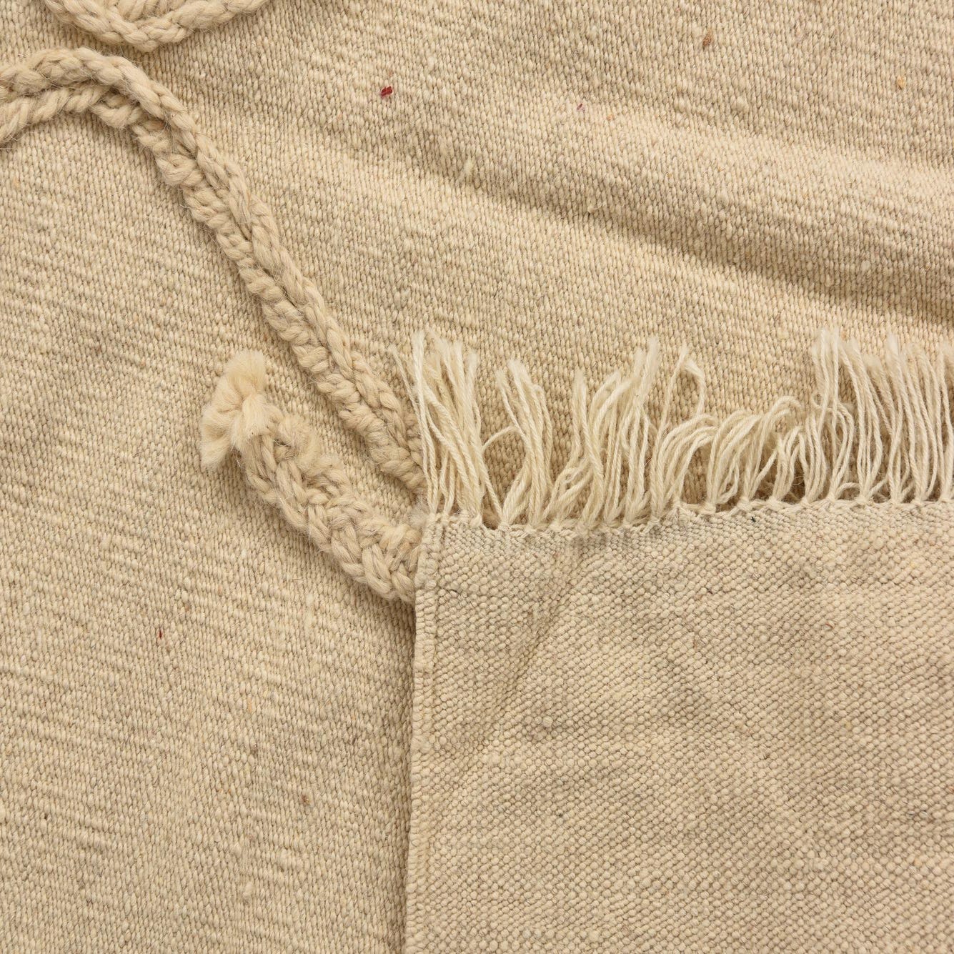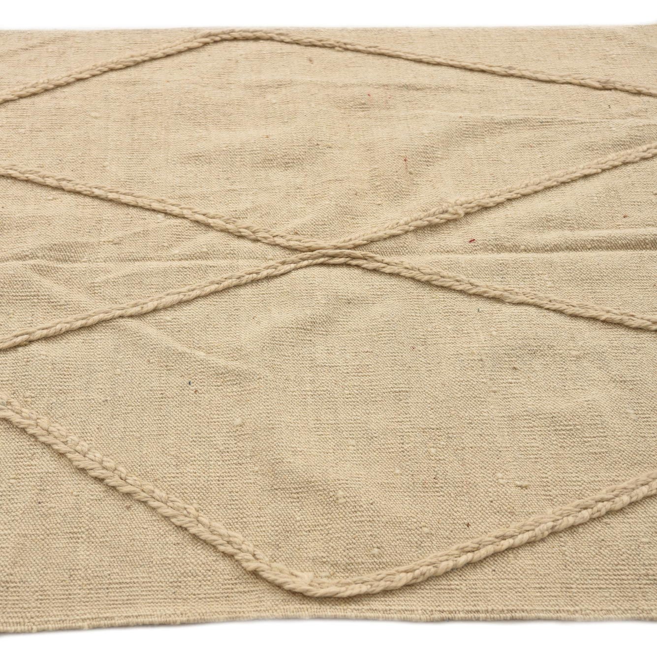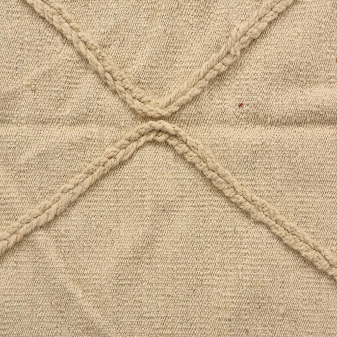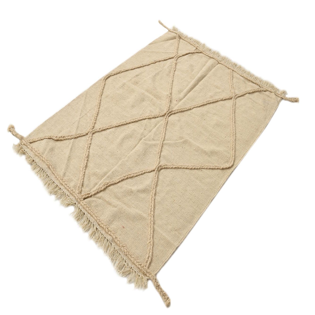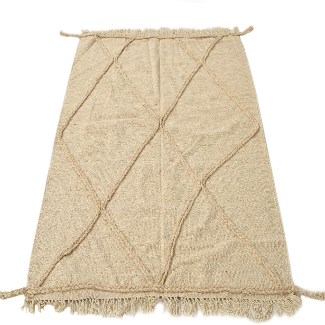 A 3x5 rectangular ivory wool shag rug with a braided tribal diamond pattern and fringed edges.