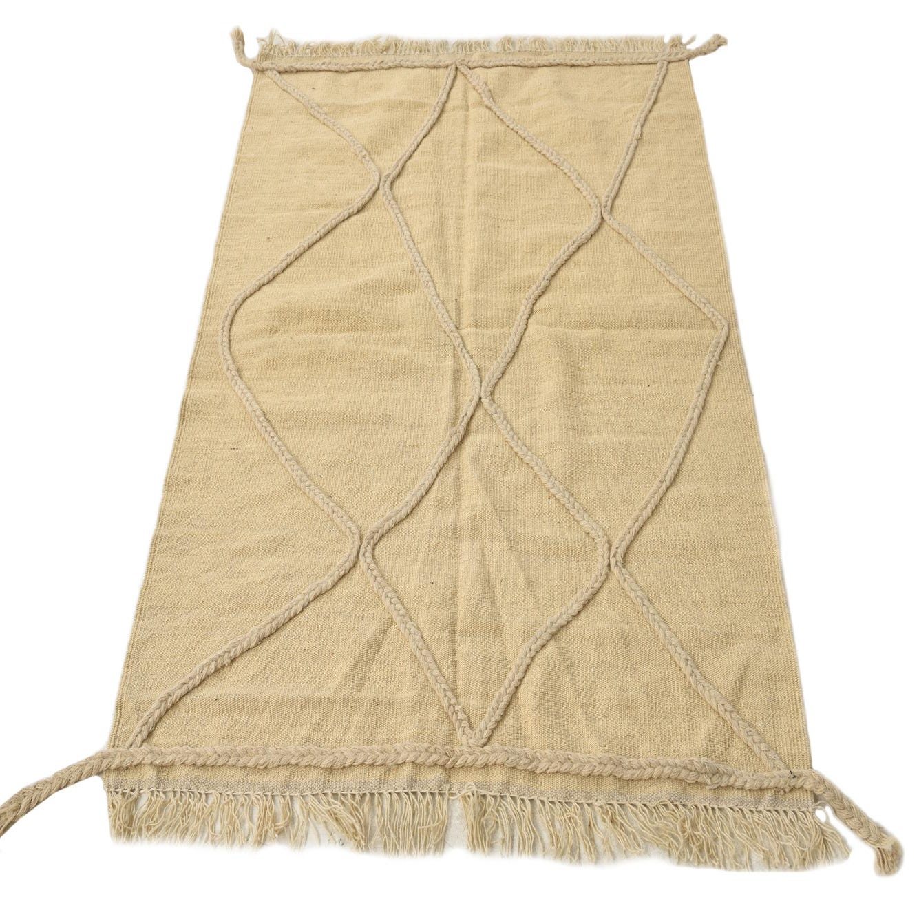 A 3x5 rectangular ivory wool shag rug with a braided diamond tribal pattern and fringed edges.