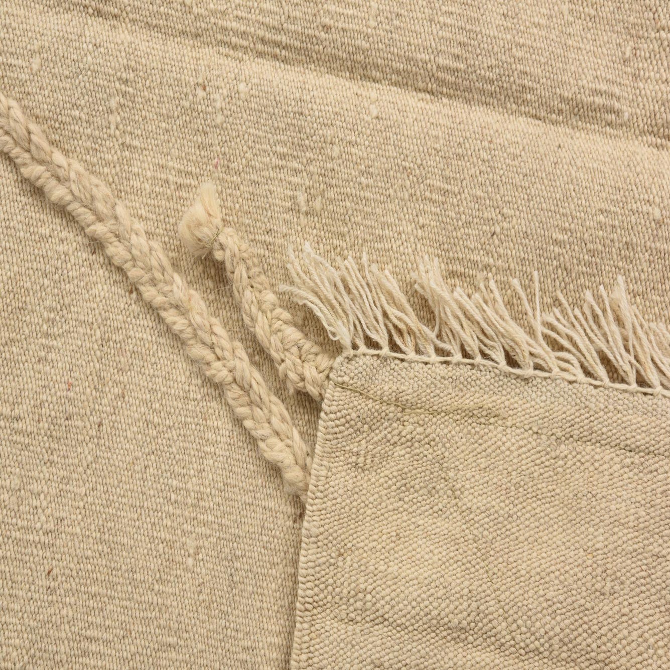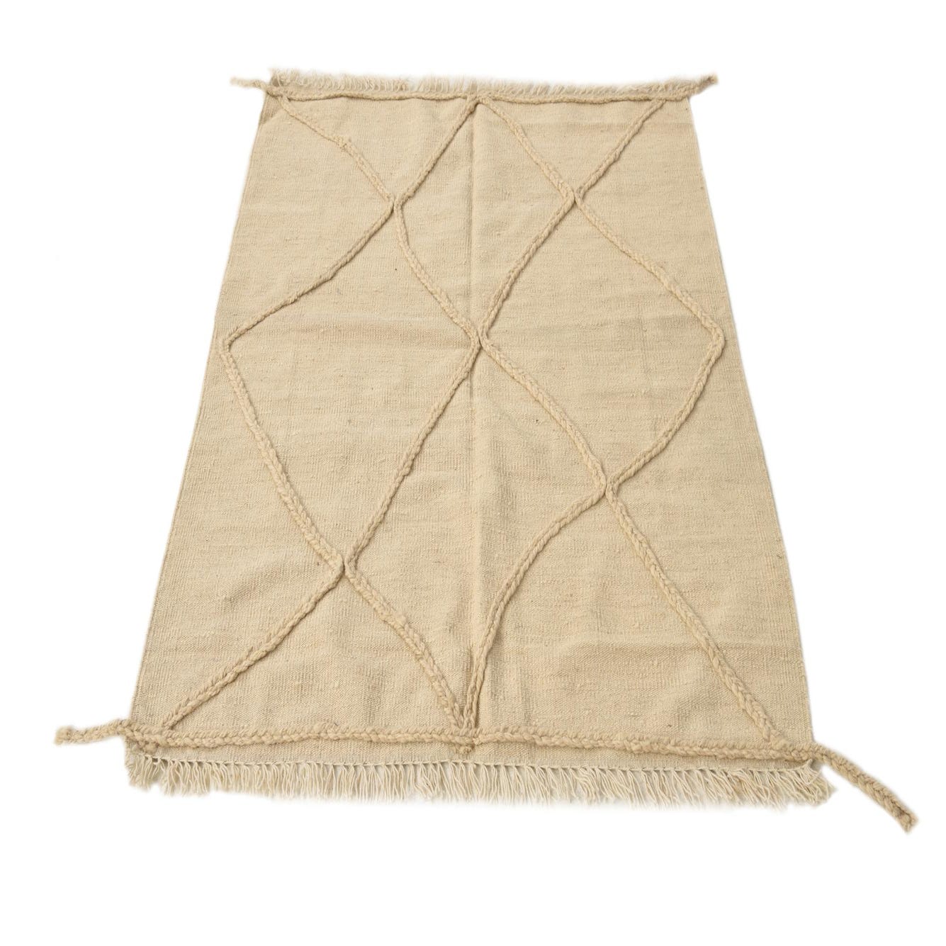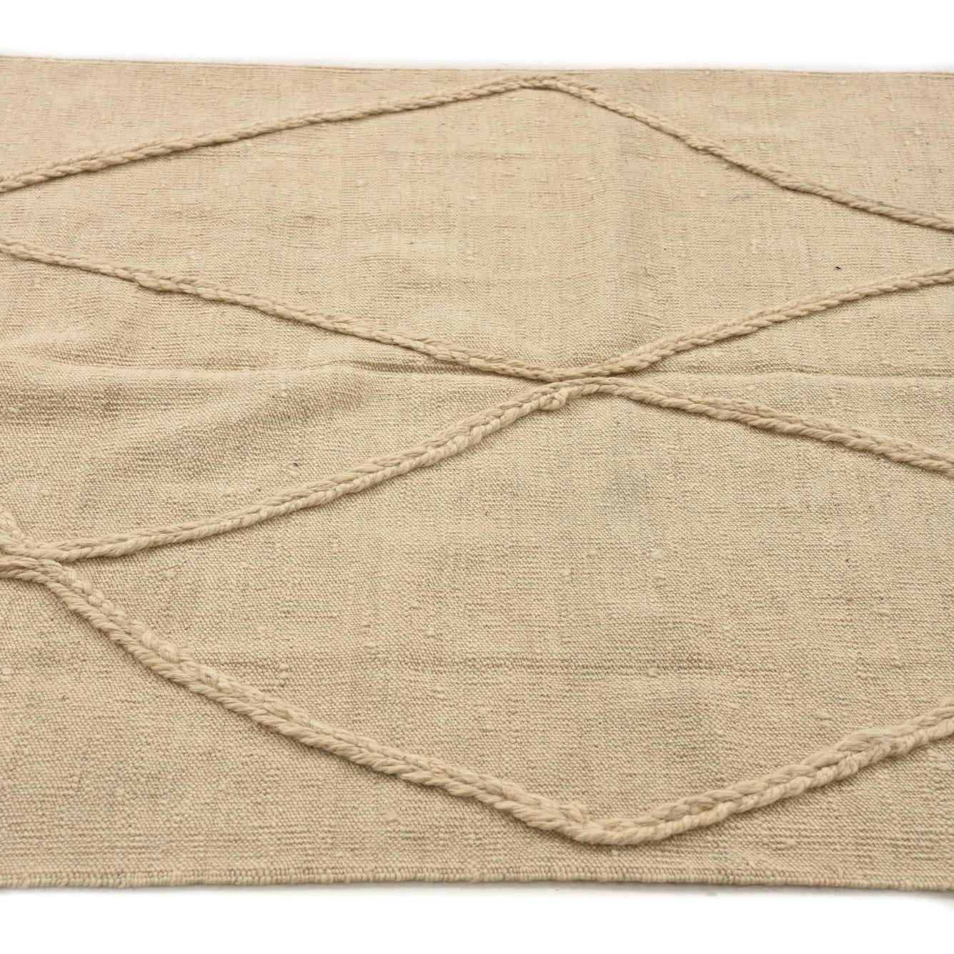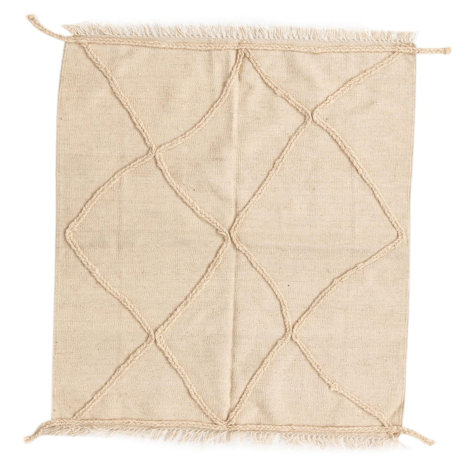 Hand-knotted from 100% wool, this piece has a soft ivory ground with a low, even pile and raised braided lines that form an open diamond lattice. Running fringe on the short ends and the lightly textured wool surface create a tactile contrast between the flat woven background and the sculpted pattern. The neutral ivory tones and natural wool variation give the rug a warm, grounded look that feels soft underfoot.