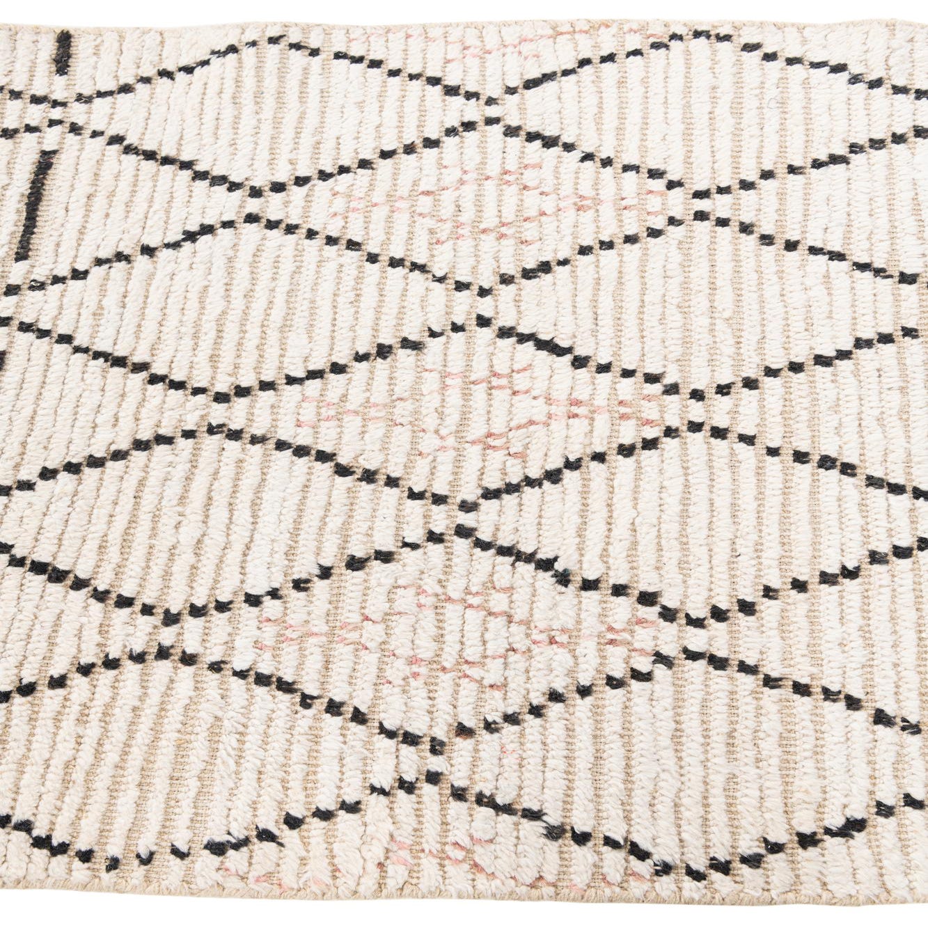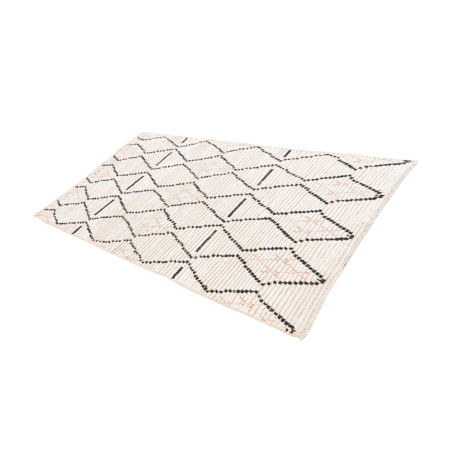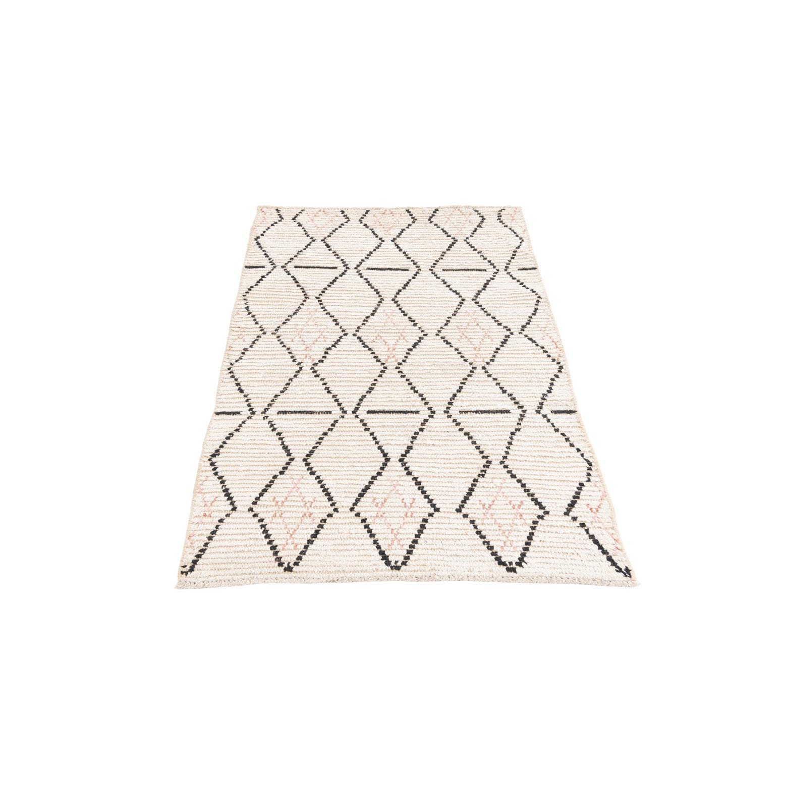 A 3x5 rectangular ivory wool shag rug featuring a modern tribal pattern of black and subtle pink diamond shapes.