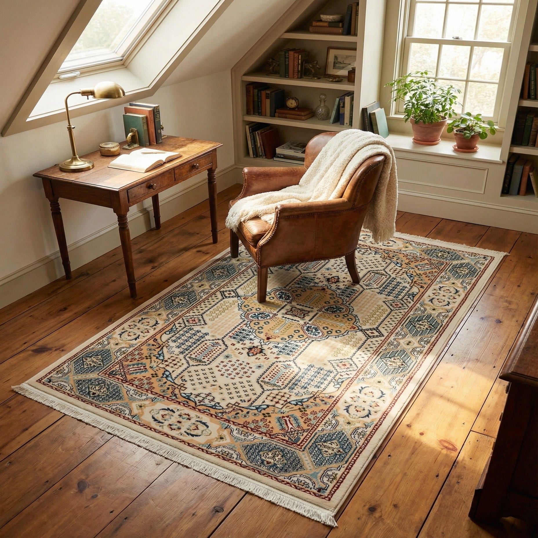 This rug works well under a seating group to ground a living room while keeping the palette light, or in an entry or hallway to introduce traditional pattern and visual interest. It pairs nicely with transitional décor—neutral upholstery, wood furniture in light to medium finishes, and metal accents in brass or matte black—and also complements more classic interiors with painted millwork or antique furnishings. In a home office or small dining area it adds measured warmth and a refined, collected feel.