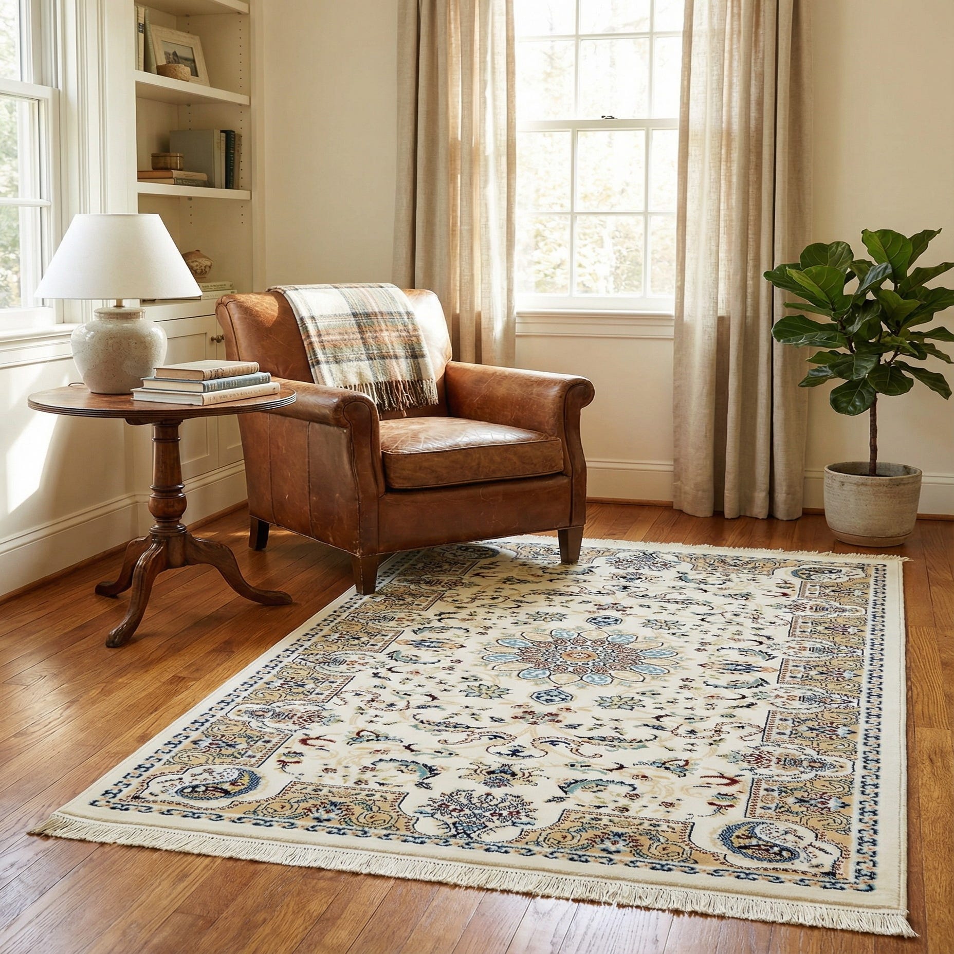 A classic medallion design anchors this rug, with a finely worked central rosette surrounded by scrolling vines, floral arabesques and a detailed guard border with corner spandrels. The background is ivory, while layers of beige and cream create a warm base. Accents of blue and navy blue provide cool contrast, and touches of burgundy, puce and green give the pattern depth and character. Machine-made from 85% polypropylene and 15% polyester, the surface has a low-to-medium pile that feels smooth and slightly resilient underfoot, with a subtle sheen from the fibers and finished fringe at each end.
