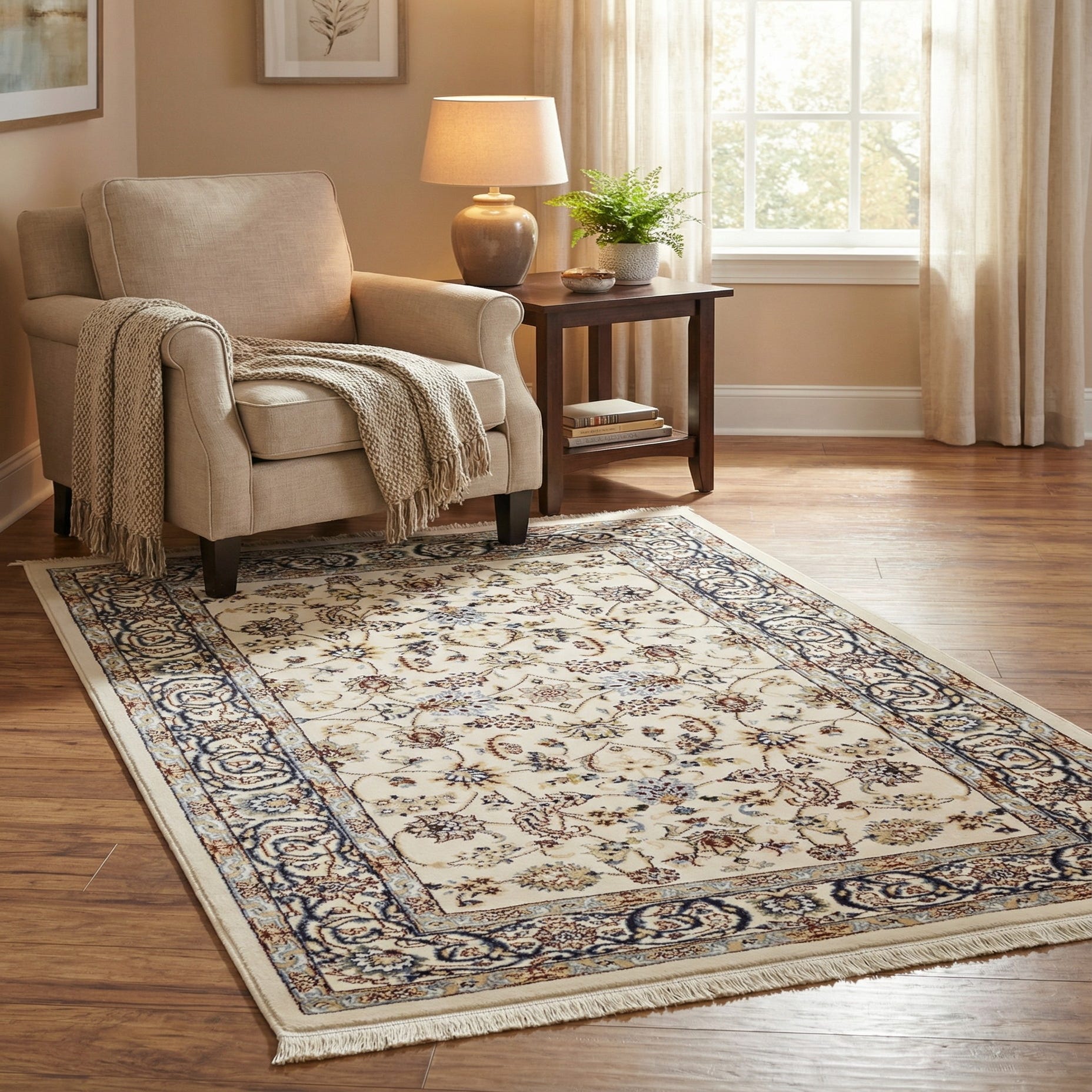 This rug works best in settings that benefit from a refined, traditional touch—paired with warm wood tones and leather, under a small seating group, or at the foot of a bed to add pattern without heavy color. It also fits transitional interiors where classic motifs mingle with contemporary furnishings, and is a good choice for an entry, home office, or reading nook. The mix of navy and burgundy accents coordinates well with navy upholstery, cream linens, or painted furniture for a layered, collected look.
