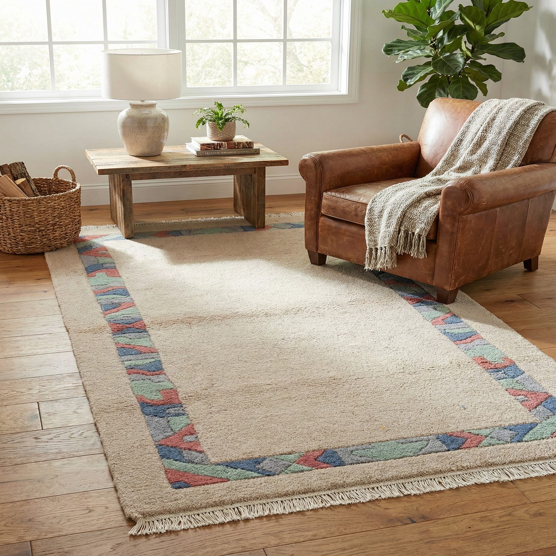 Hand-knotted of 100% wool, the rug has a dense, softly padded surface with a low-to-medium pile that feels warm and substantial underfoot. The restrained color palette and simple border make it a versatile choice for a range of interiors — pair it with light, Scandinavian-inspired furnishings for an airy feel, layer it into a boho or eclectic scheme to introduce structure, or use it in transitional settings to bridge traditional and modern pieces. Place it in an entry, in front of a desk, at the foot of a bed, or layered beneath a small seating vignette to add texture and a touch of pattern.