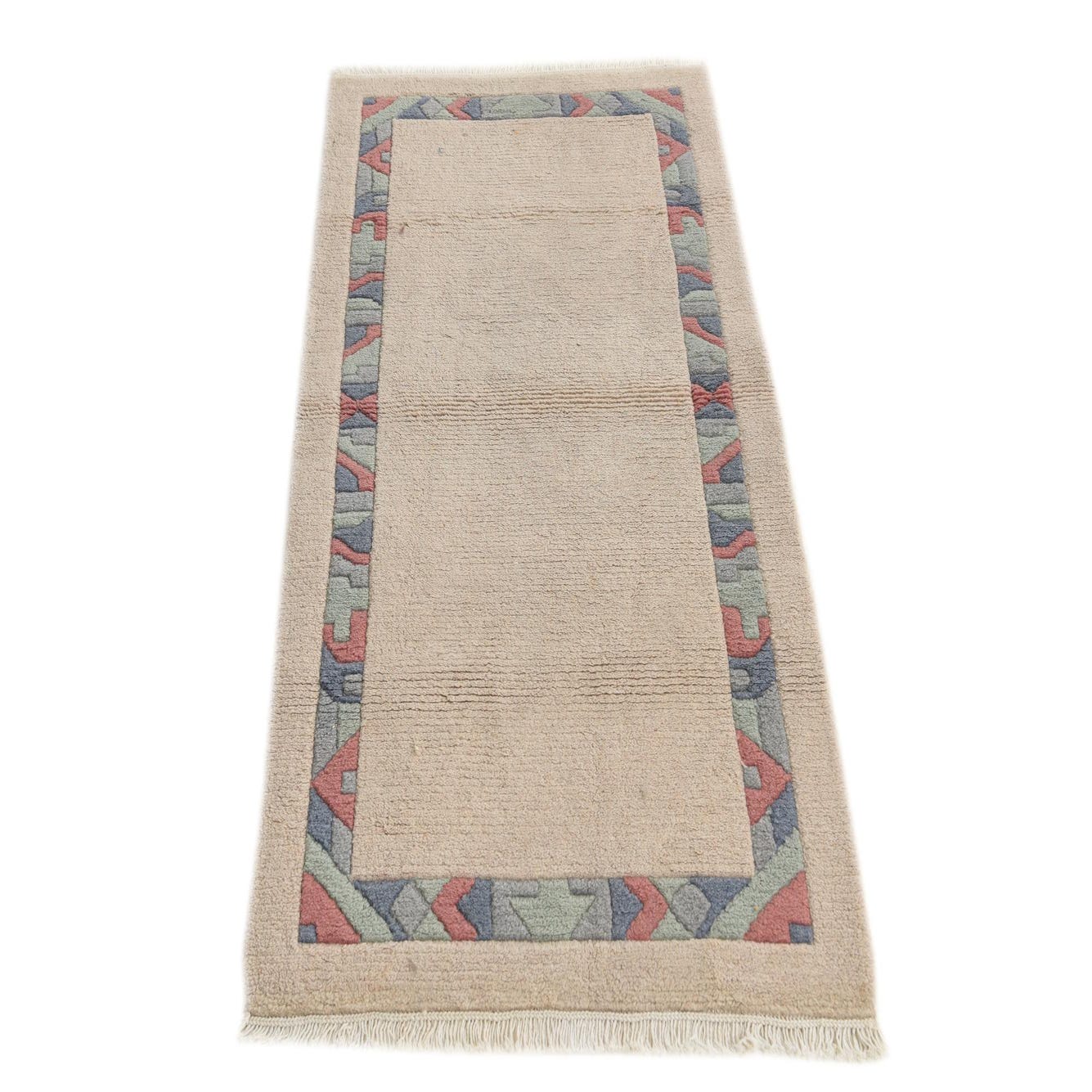 A clean ivory field creates a calm, neutral backdrop for a narrow geometric border rendered in soft blue, red and green. The border uses angular chevrons and interlocking block shapes for a subtle, hand-drawn look that adds visual interest without overwhelming a room. Short fringe at the narrow ends and linear ribbing across the weave add quiet, tactile details that catch the eye up close.