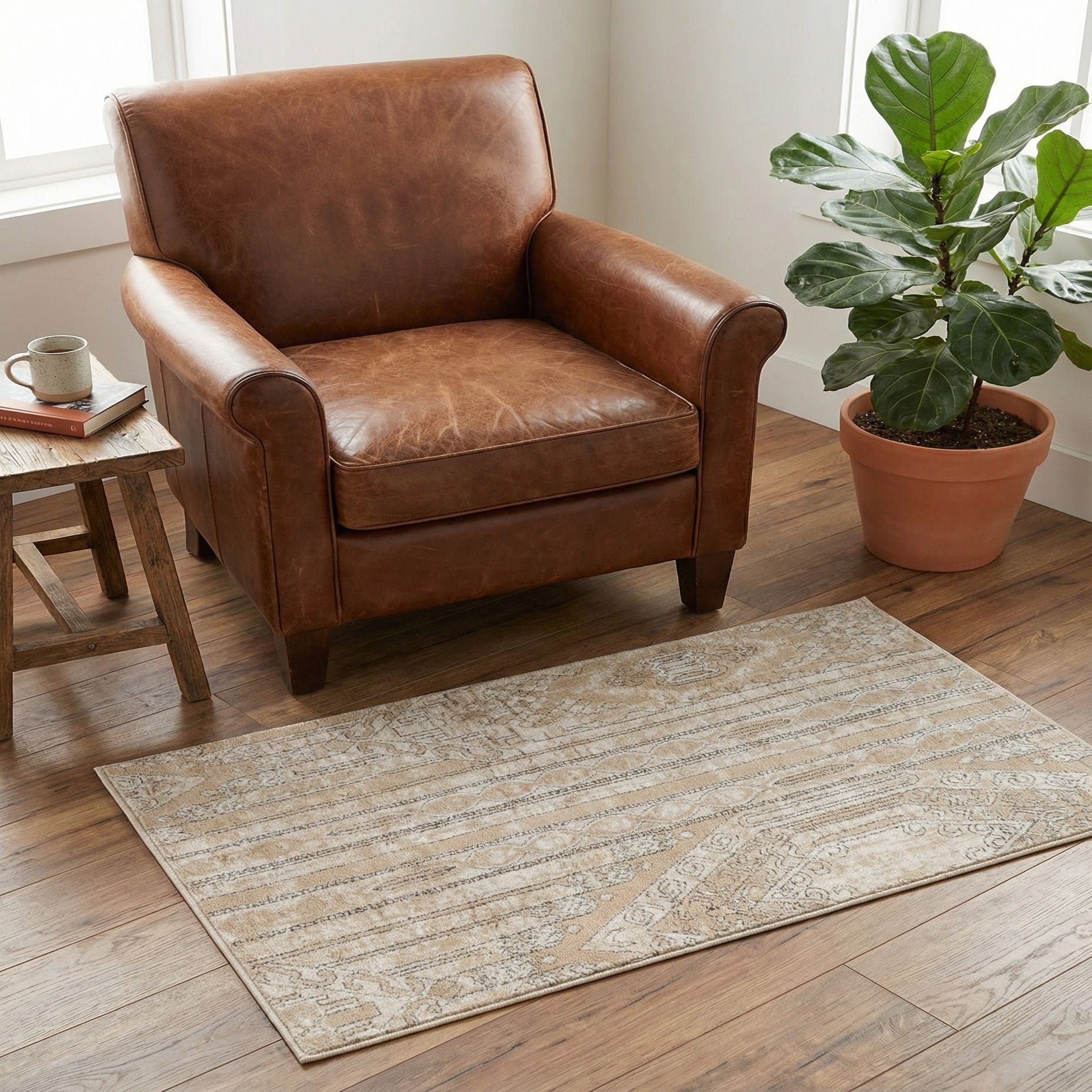 Machine made from 85% polypropylene and 15% polyester, the rug has a low-to-medium pile that feels soft underfoot while showing slight variation in texture where the motifs are raised. The polyester adds a mild sheen that helps the gray outlines pop against the ivory base. This neutral palette and approachable texture work well in a relaxed living room, an entry or foyer, a bedside area, or a small seating nook. Pair it with light wood furniture, linen upholstery, and charcoal or pewter accents for a modern farmhouse or transitional look, or layer it over natural-fiber flooring to add warmth to Scandinavian and coastal interiors.