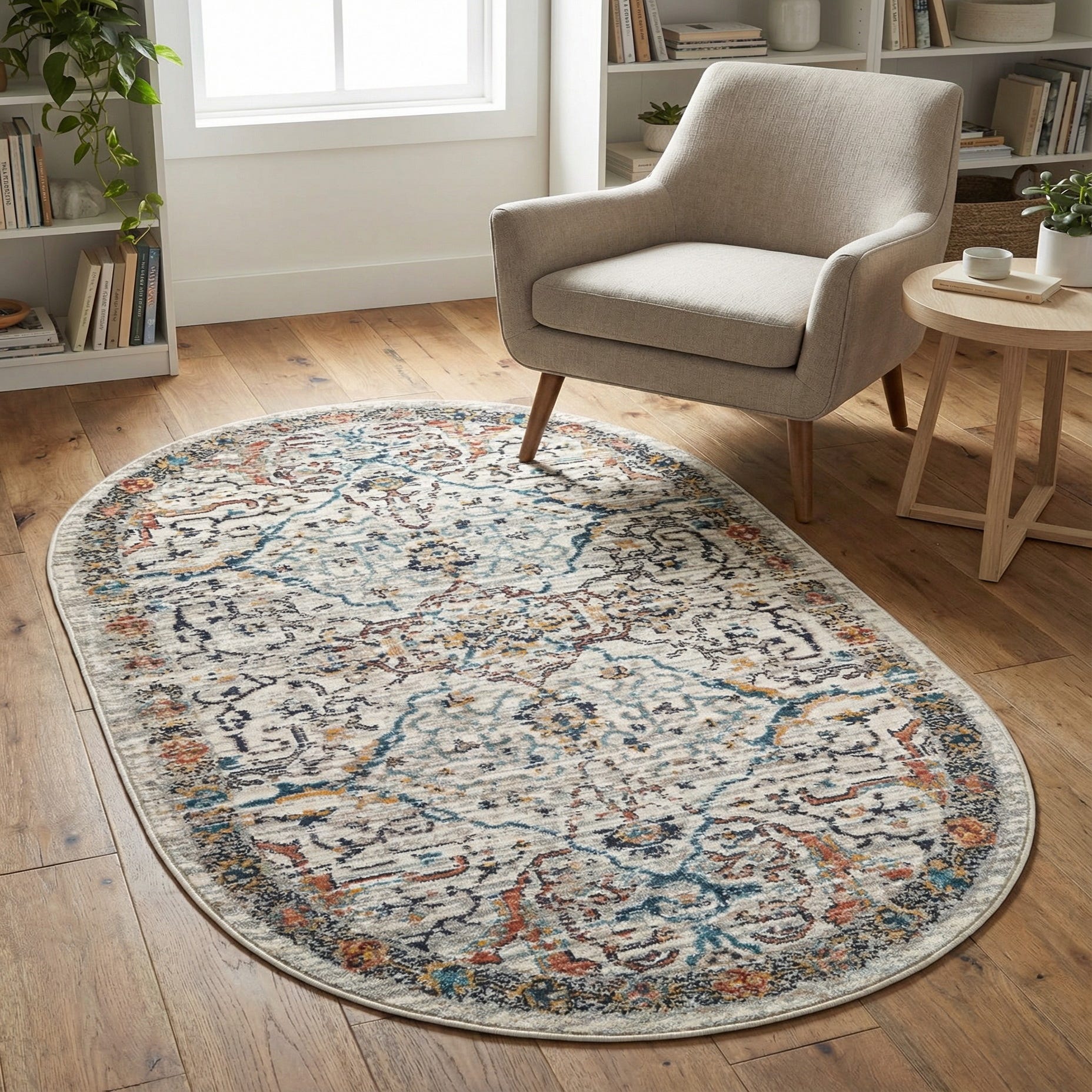 An oval 3' 3 x 5' 3 ivory and cream polypropylene rug with a distressed traditional pattern in blues, oranges, and grays.