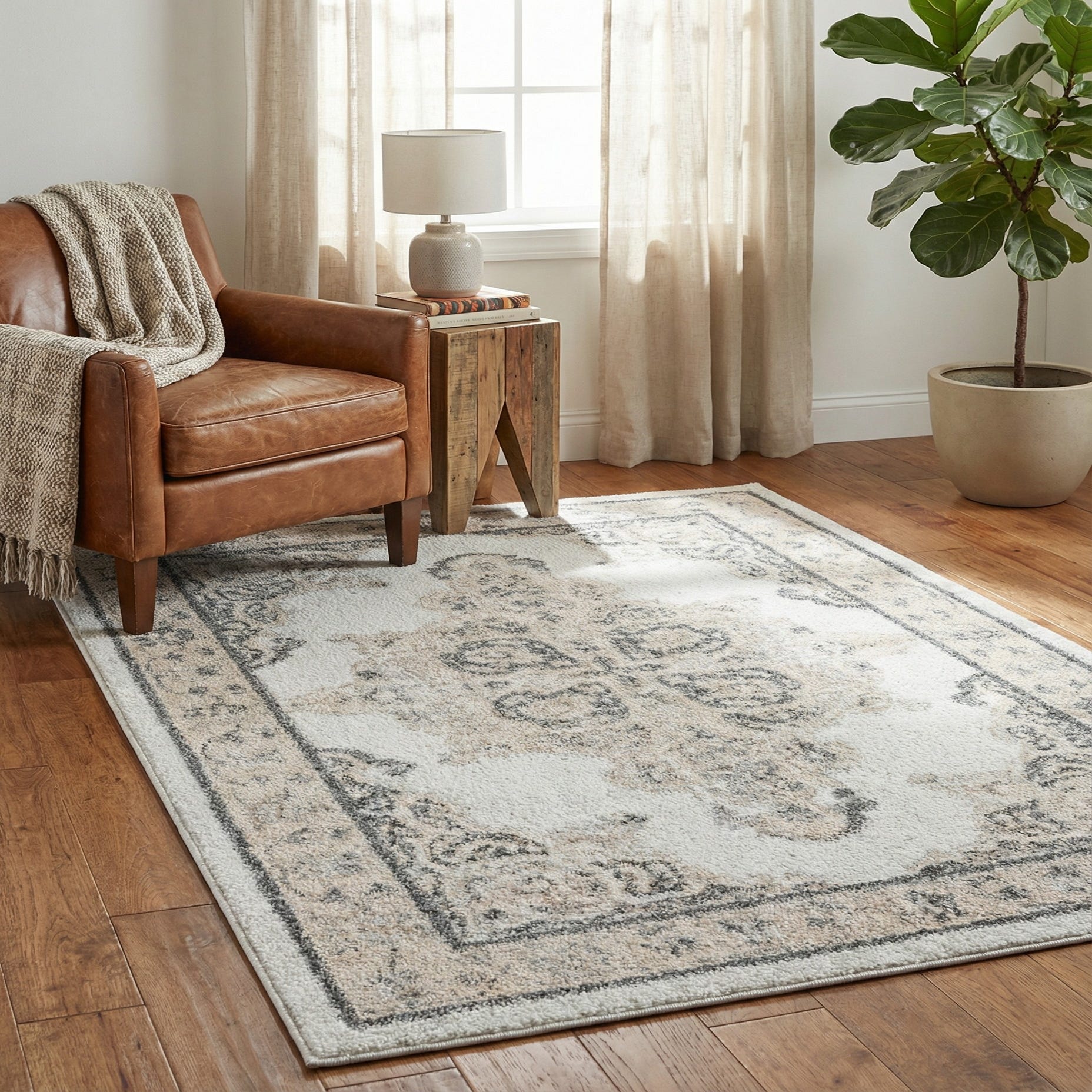 A soft ivory field sets a calm backdrop for a gently distressed medallion and ornate border worked in warm beige and muted gray. The traditional motif has an aged, low-contrast finish that gives the pattern a lived-in look without heavy contrast, while the decorative border frames the medallion for a balanced, classic silhouette. Running your hand across the surface, the machine-made construction feels smooth and slightly cushioned—enough texture to add interest underfoot while maintaining a low-profile appearance.