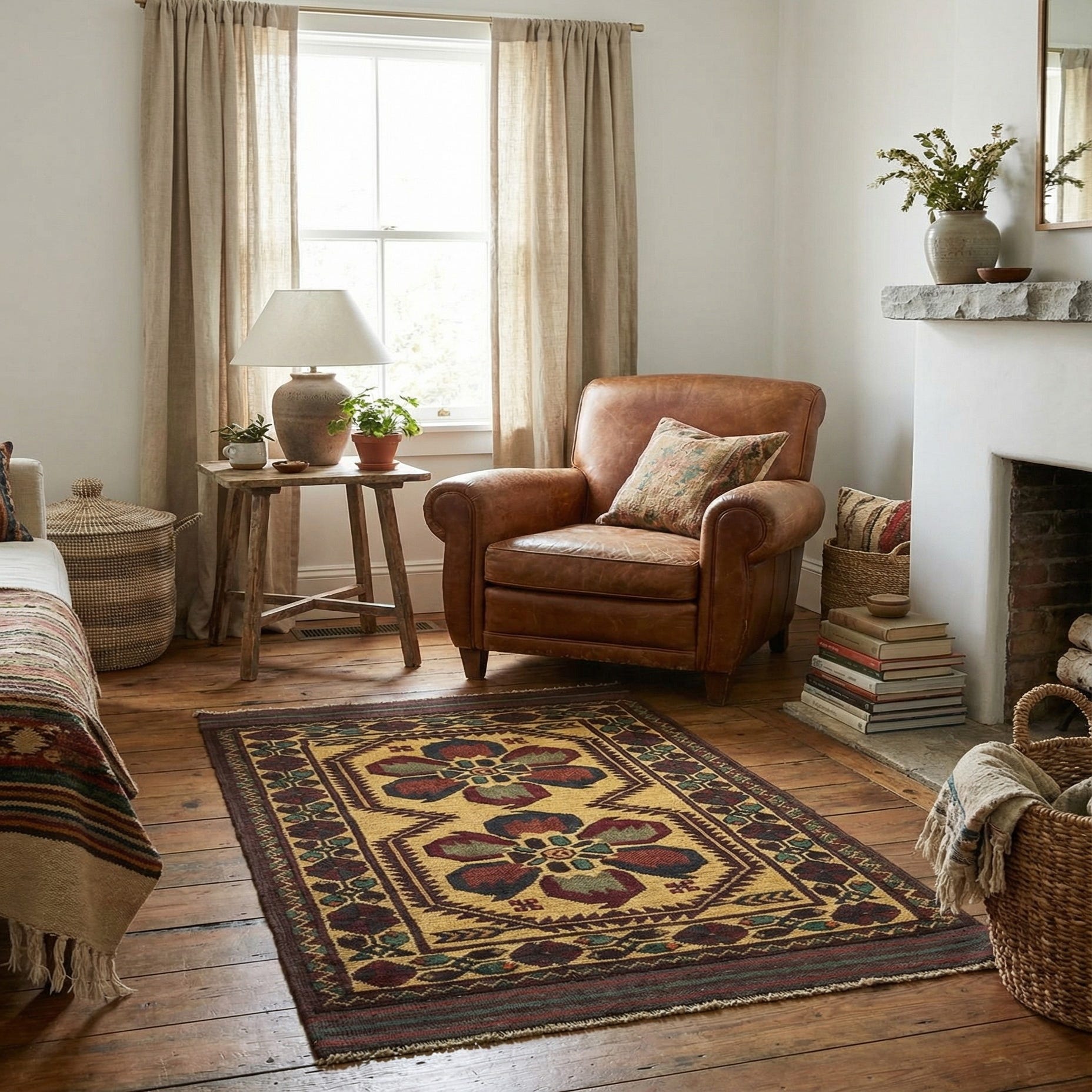 Ideal for an array of interior design scenarios, this rug would complement rooms with a classic, rustic, or global decor aesthetic. Its rich, earthy tones and intricate pattern make it a versatile addition to a living room, study, bedroom, or a cozy nook that calls for a touch of warmth and character.