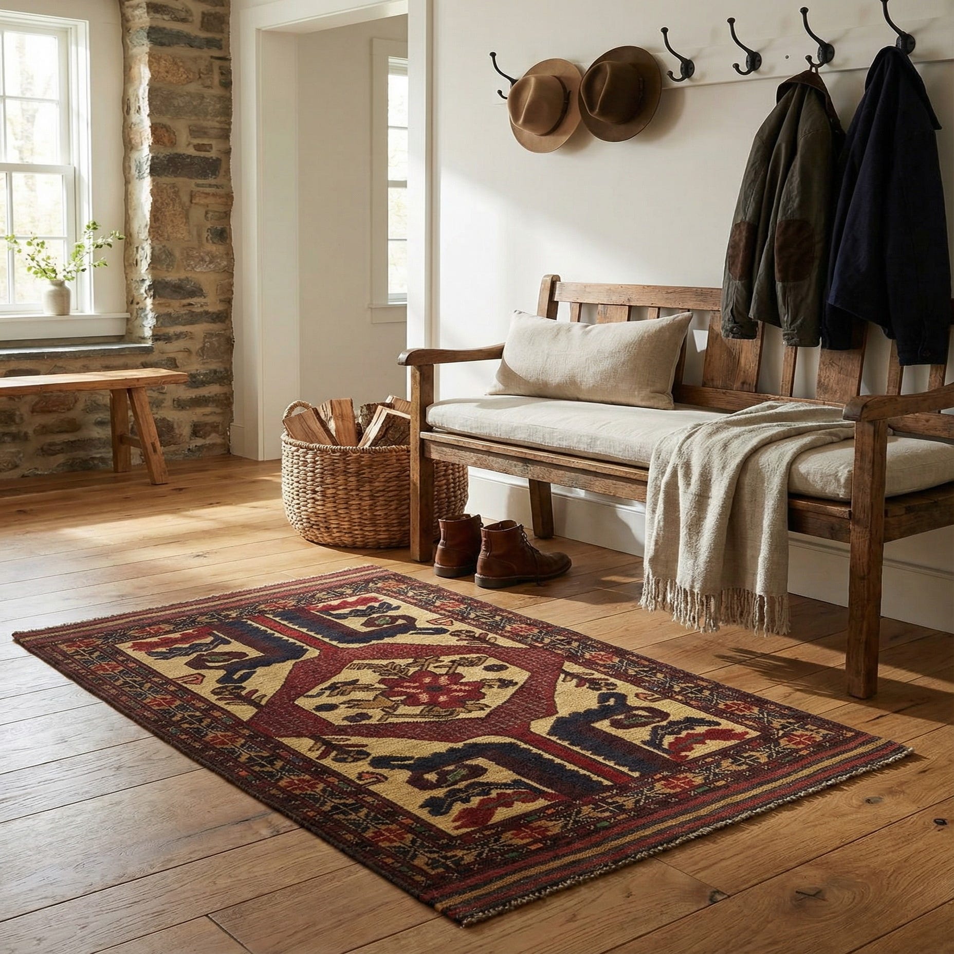 This rug fits well where you want a strong visual anchor without overwhelming the room — place it in an entry or hallway to greet guests, tuck it into a cozy reading corner, or layer it under a small seating grouping to add warmth and pattern. It pairs naturally with leather or mid-century wood furniture, neutral upholstery, and warm metal accents for a collected, lived-in look.