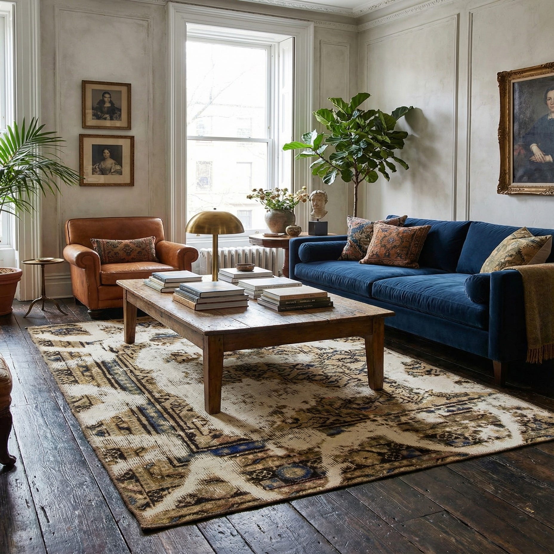 This Ultra Vintage collection rug presents a beautifully aged aesthetic, achieved through a refined hand-knotting process of 100% wool fibers. The 3x5 rug features an ivory background, complemented by a sophisticated palette of blue, brown, burgundy, navy blue, and beige. The pattern, reminiscent of time-honored designs, showcases intricacies and nuances that give the piece a sense of history and depth. The rug's texture is characteristic of high-quality wool, providing durability and a plush underfoot experience.