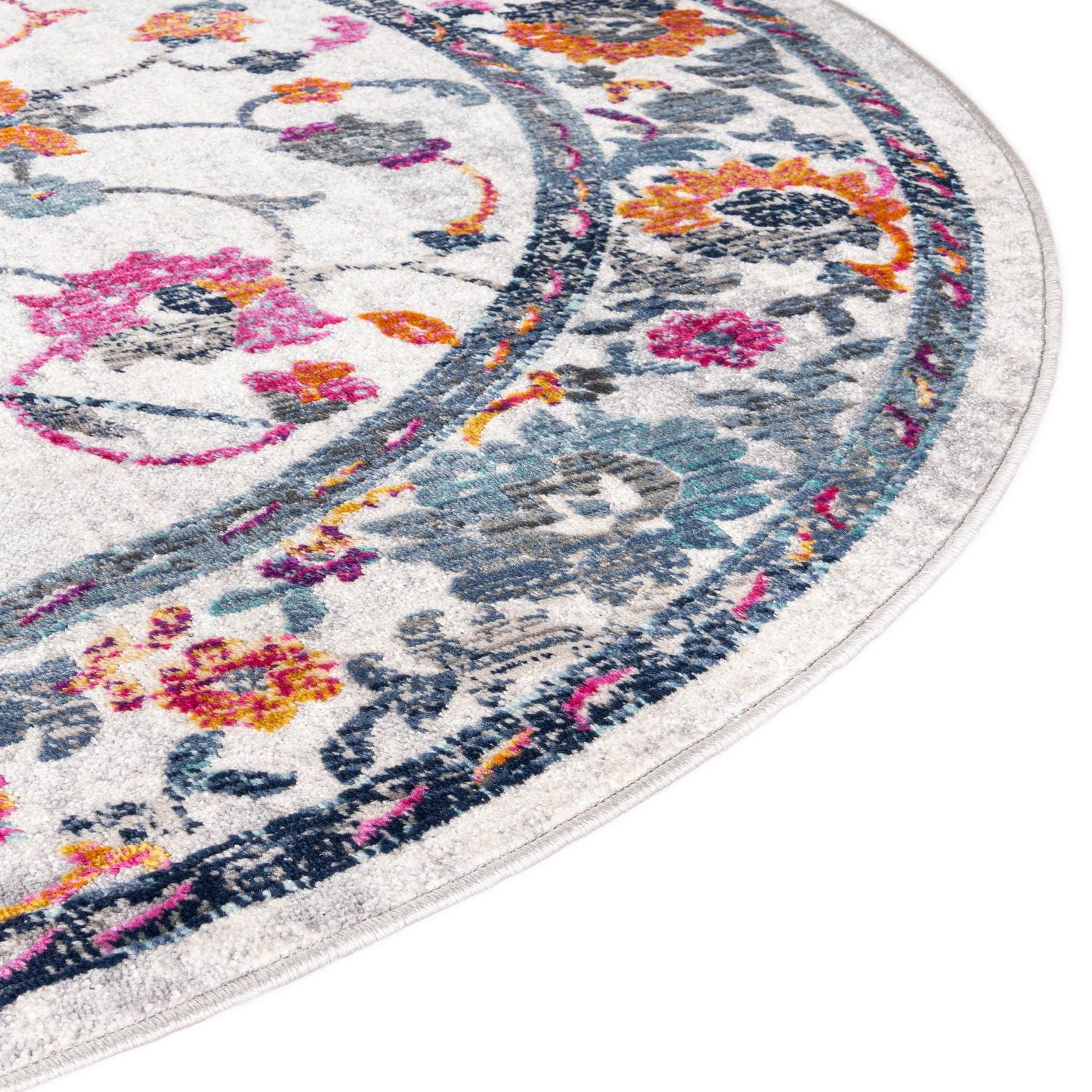 A 3' 7 round ivory Bohemian rug with a distressed floral medallion pattern in blue, pink, orange, and purple.