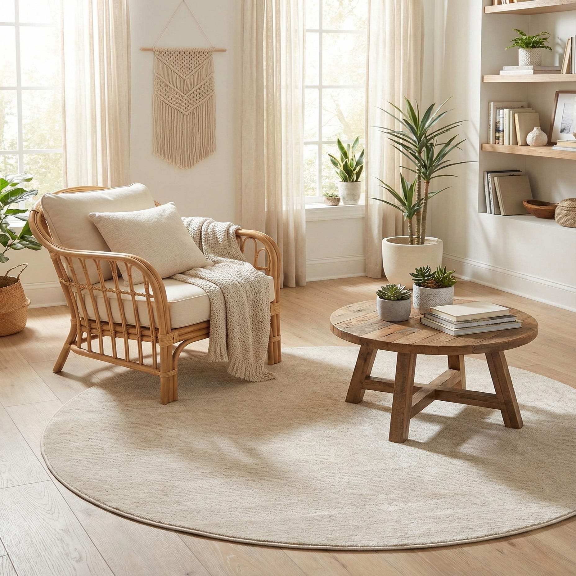 The round shape and neutral palette suit a range of interiors—from modern and Scandinavian to coastal and transitional. Use it beneath a small round dining table, to anchor a cozy seating nook, at the foot of a bed, or to soften a nursery or entry area. Its understated color pairs easily with warm woods, painted neutrals, or muted accents for a calm, layered look.