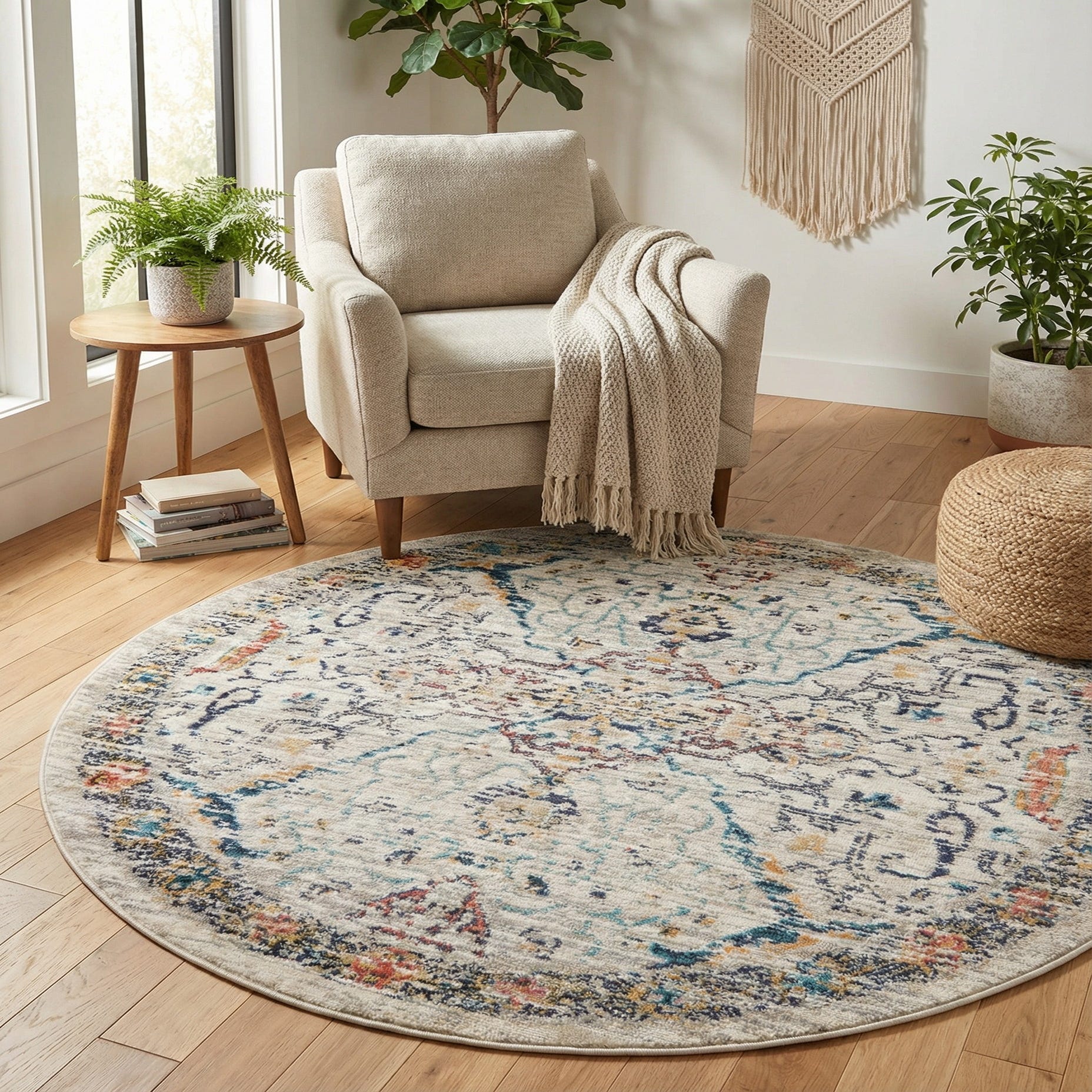 A 4' round ivory and cream rug with a distressed traditional and tribal pattern in blue, orange, and yellow accents.