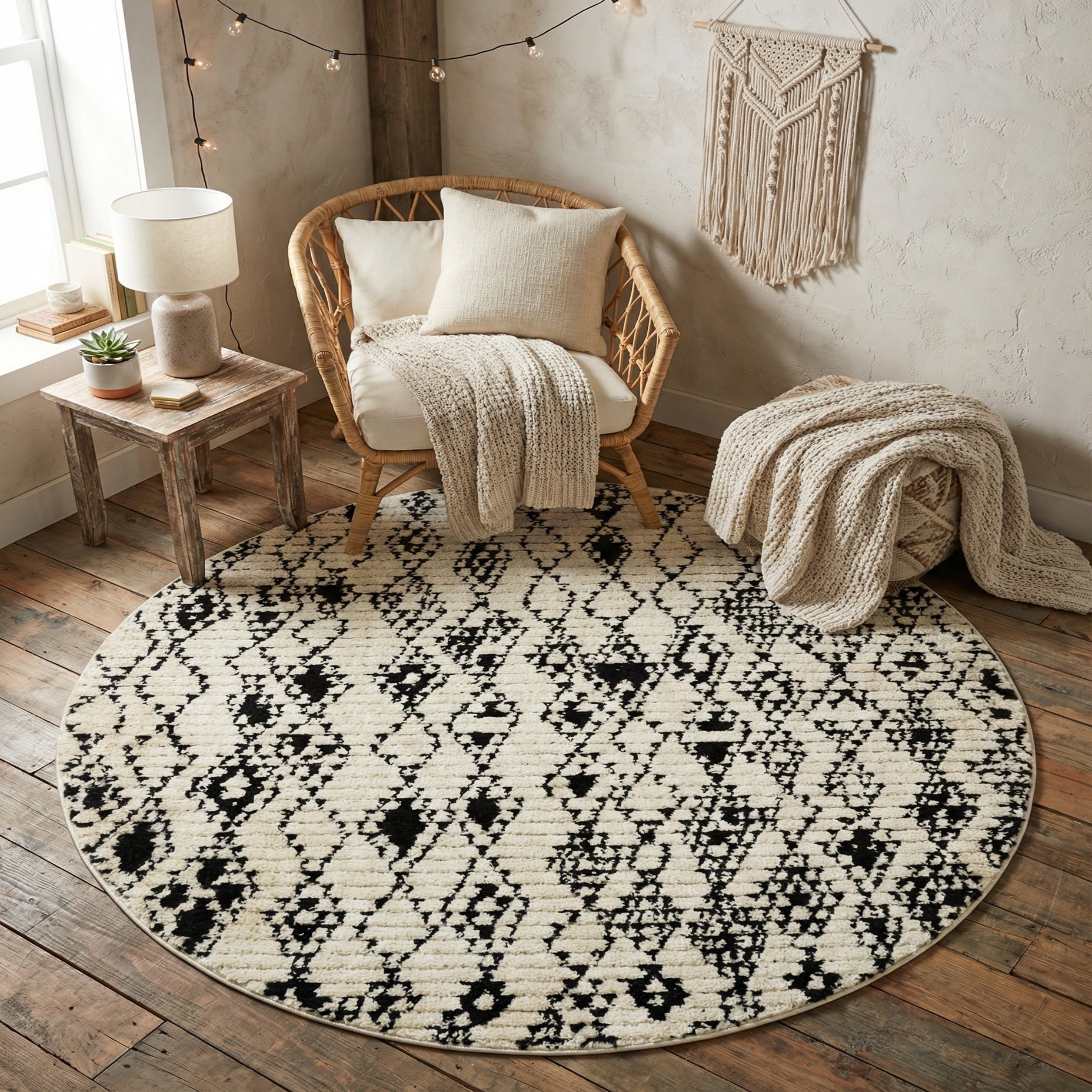 This rug pairs naturally with warm wood tones, leather or rattan furniture, and simple black or brass accents for a balanced contrast. Use it to anchor a cozy reading nook, beneath a small round dining set, or layered in a living room to introduce pattern without overwhelming the space. Its monochrome palette and tactile surface suit modern boho, Scandinavian minimalism, and transitional interiors looking for a grounded, graphic element.