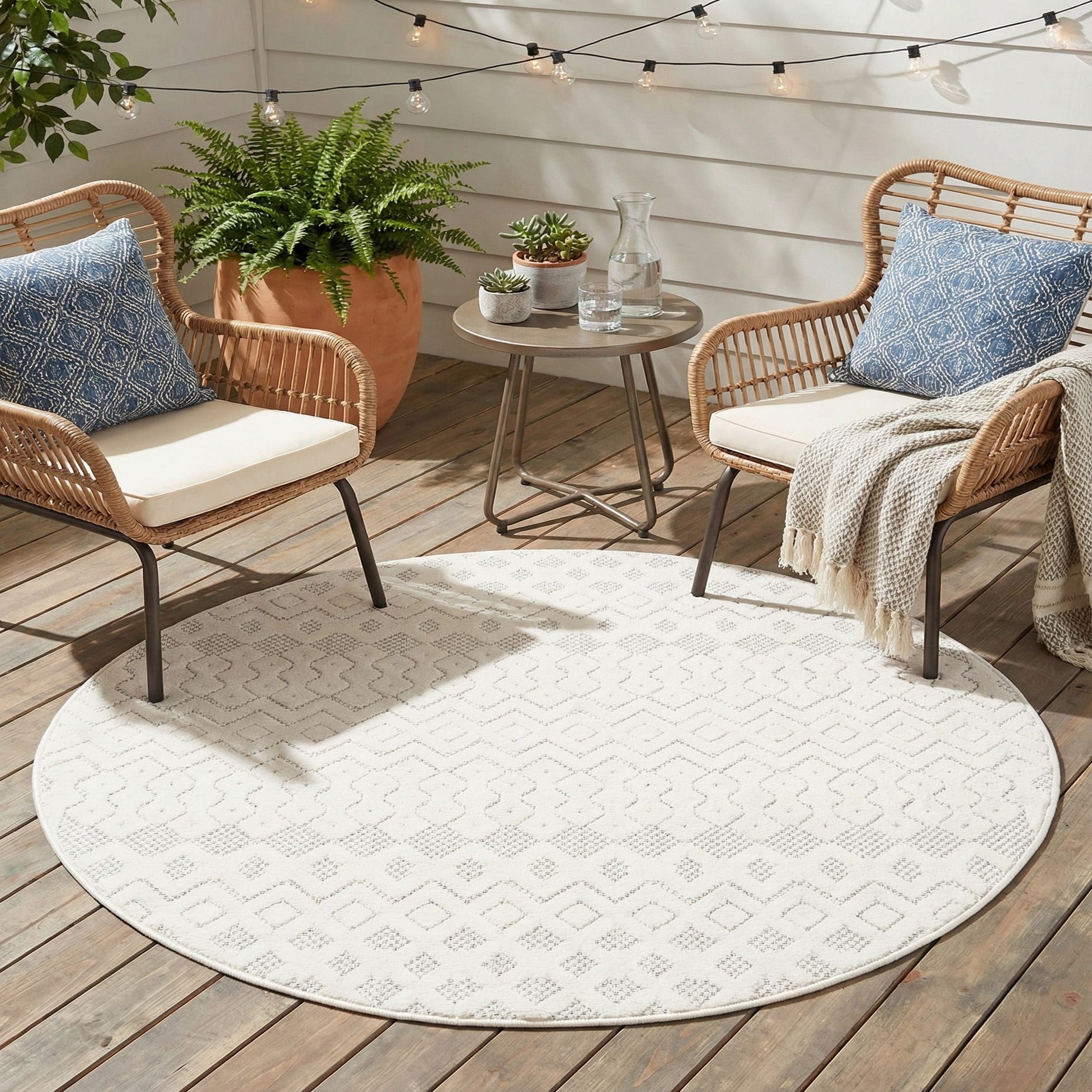 A 4' round ivory and white polypropylene rug featuring a textured tribal trellis pattern, suitable for indoor or outdoor use.