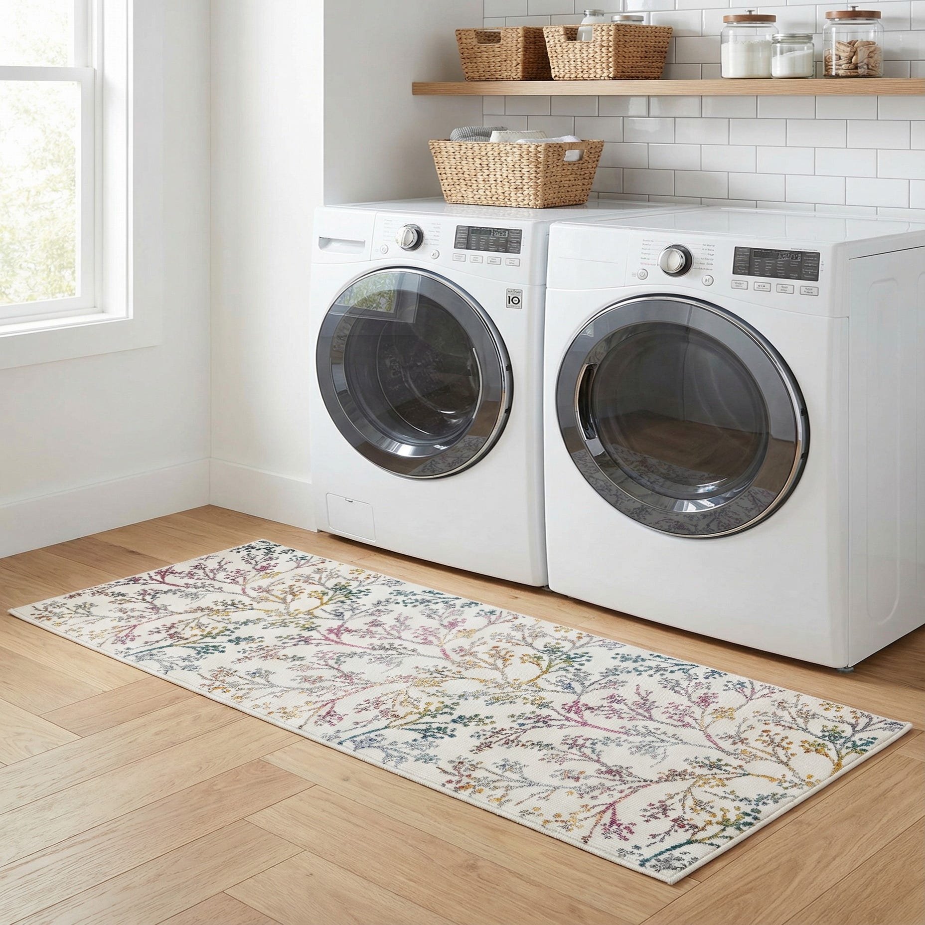 This runner works well in narrow spaces that need a brightening touch—hallways, entryways, and kitchen aisles—or layered in front of a bed or console to add subtle color. It pairs easily with light wood tones, pale painted cabinets, or soft gray upholstery, and complements interiors ranging from modern cottage and Scandinavian to contemporary transitional schemes. Use it to introduce gentle color and a botanical motif while keeping the overall palette calm and cohesive.
