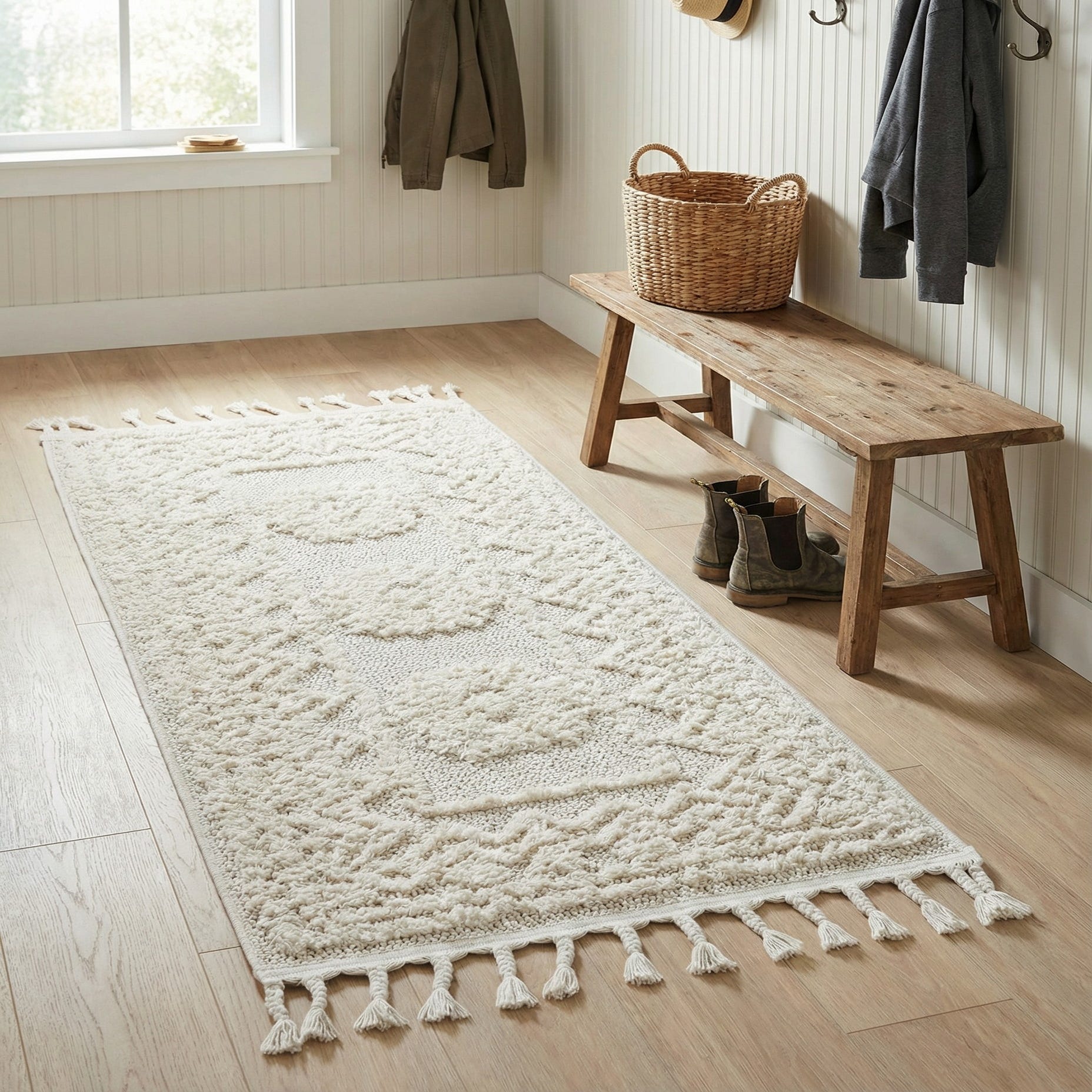 Ideal for hallways and narrow entryways, this runner also works well layered in front of a low-profile sofa, along the side of a bed, or in a galley-style kitchen to warm up hard floors. Its neutral ivory palette and mixed-texture surface pair naturally with light woods, linen upholstery, rattan or wicker accents, and muted color schemes—complementing modern farmhouse, coastal, Scandinavian, and relaxed contemporary interiors.