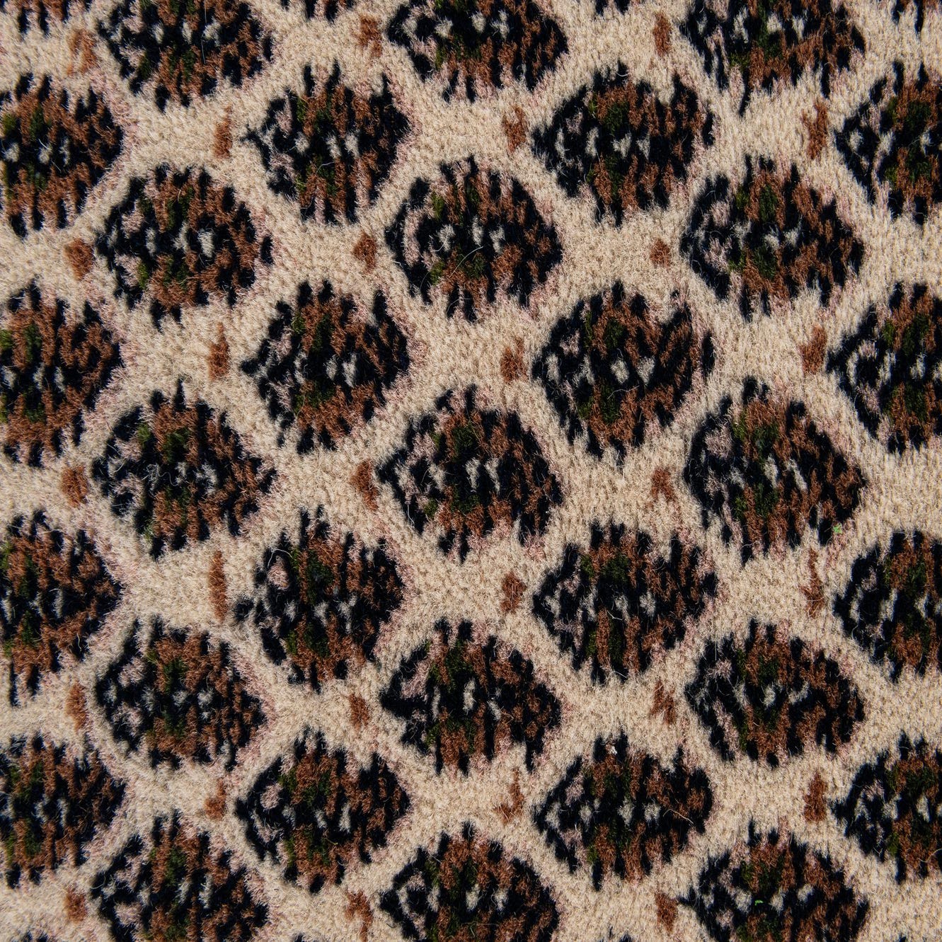 Primary color is Ivory. Colors in this rug include: Ivory, Beige, Black, Blue, Brown, Light Brown, Green.