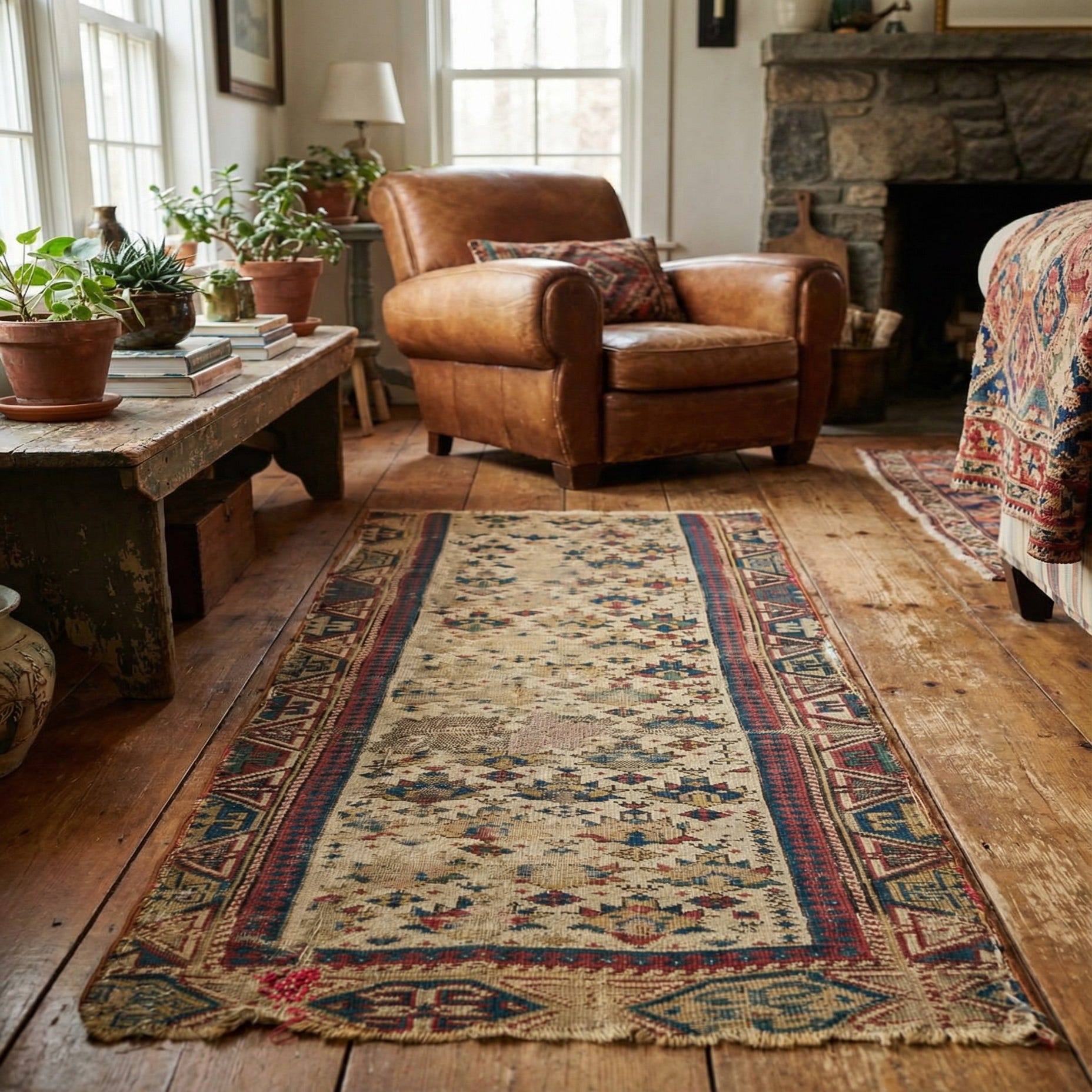 Ideal for those who appreciate vintage charm and cultural heritage, this rug can serve as an accent piece in an entryway, alongside a bed in a bedroom, or in a hallway. Its rich colors and intricate patterns would complement interiors with dark wood furnishings, leather accents, or a more traditional setting that emphasizes natural materials and earthy hues. Similarly, for a contemporary twist, it would pair well with minimalist decor as a statement piece, bringing warmth and a sense of history to the space.