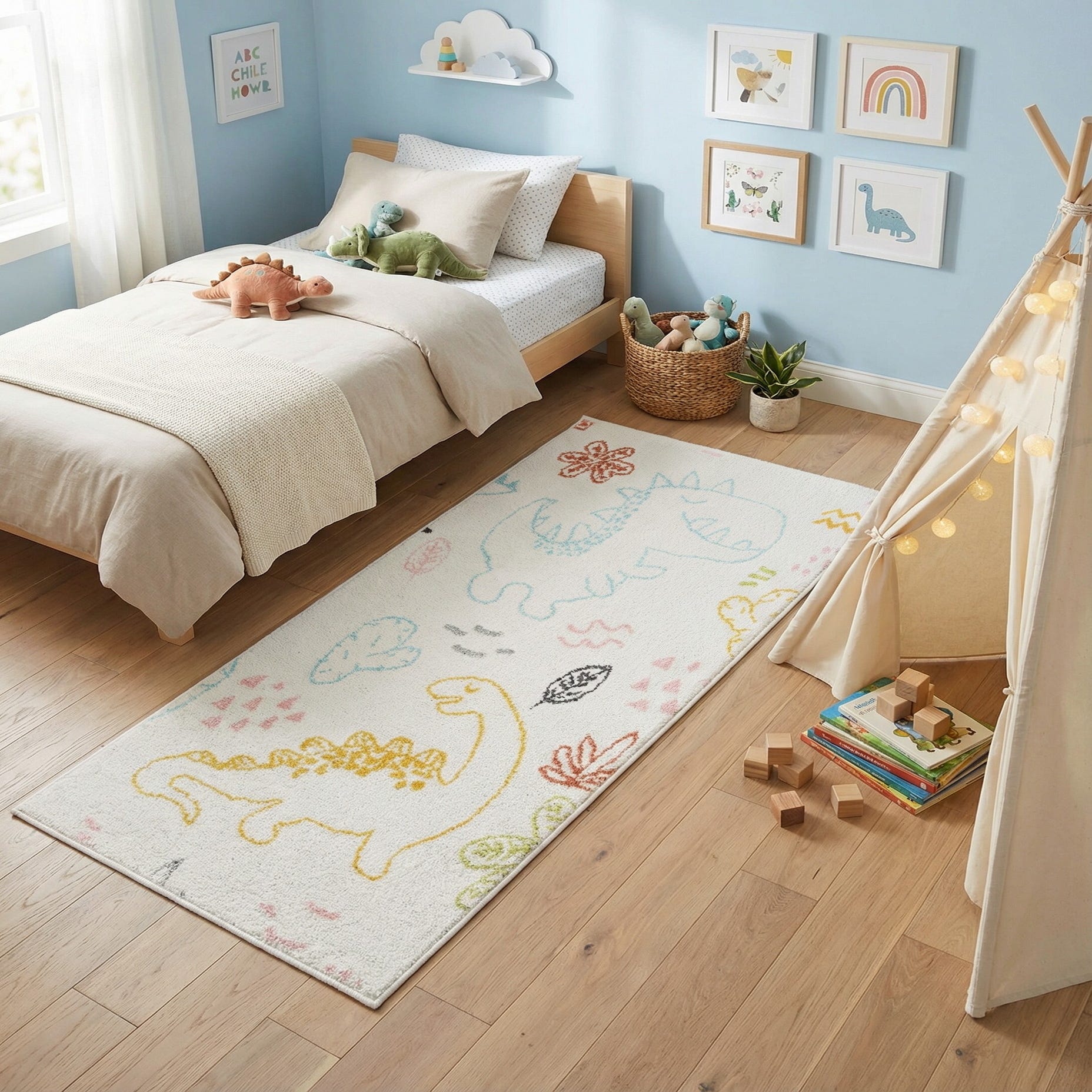 Made from 100% polypropylene, the rug has a low-to-medium pile that feels cushioned underfoot and shows a subtle textural contrast where the colored motifs sit slightly raised against the background. Place it as a runner down a hallway to brighten a transitional space, layer it in a nursery or kids’ bedroom to anchor a play or reading nook, or use it to add a cheerful touch to a casual family area. It pairs naturally with soft pastels and natural woods for a Scandinavian-inspired nursery, or with brighter accents and mixed patterns in a more eclectic kids’ room.