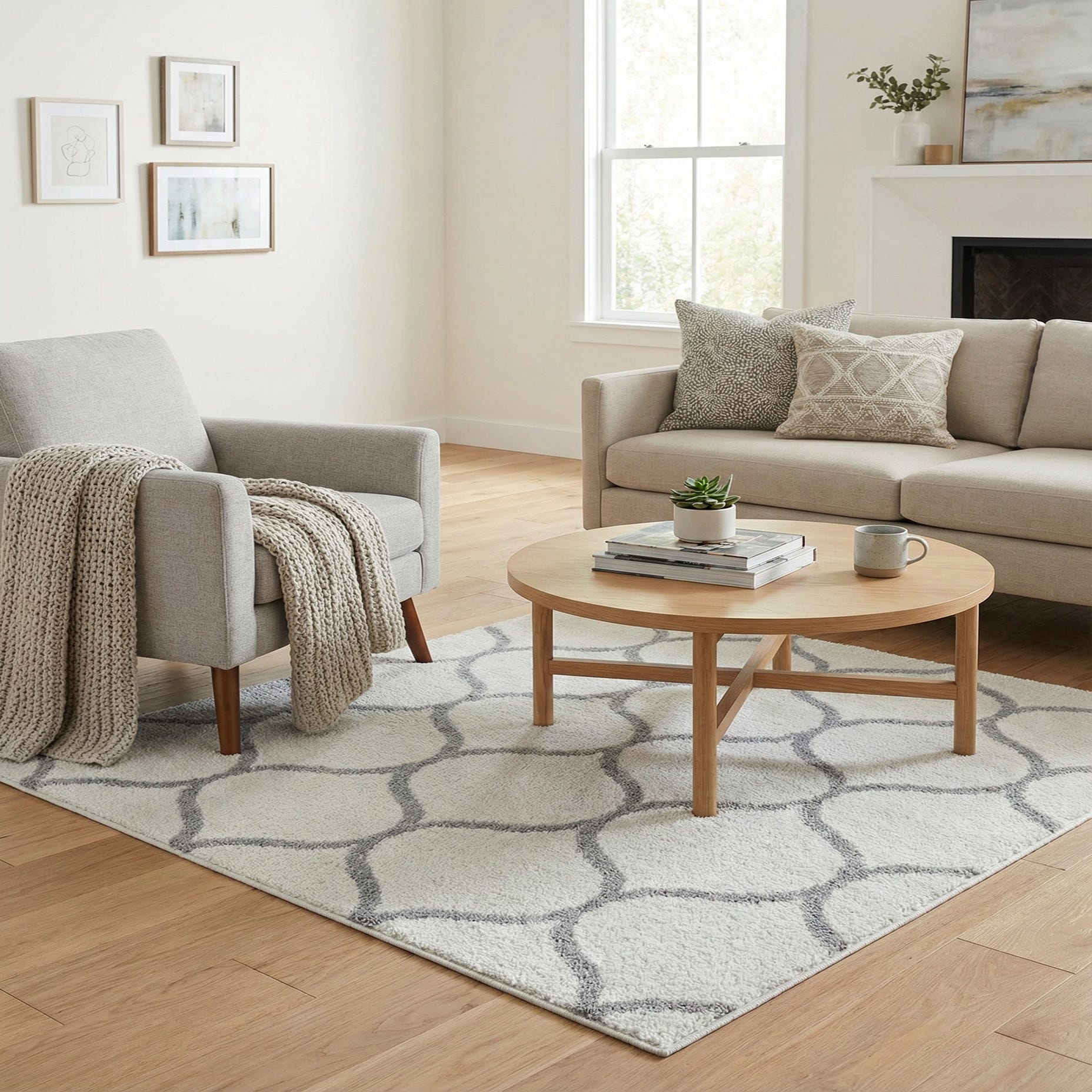 This rug pairs well with modern and transitional interiors — think a pared-back living room with light wood furniture and gray upholstery, a cozy bedroom layered with neutral linens, or a compact home office where the pattern adds rhythm without overpowering the space. It also works in Scandinavian or coastal-inspired schemes, where its light palette and simple geometry complement natural textures and muted accents.